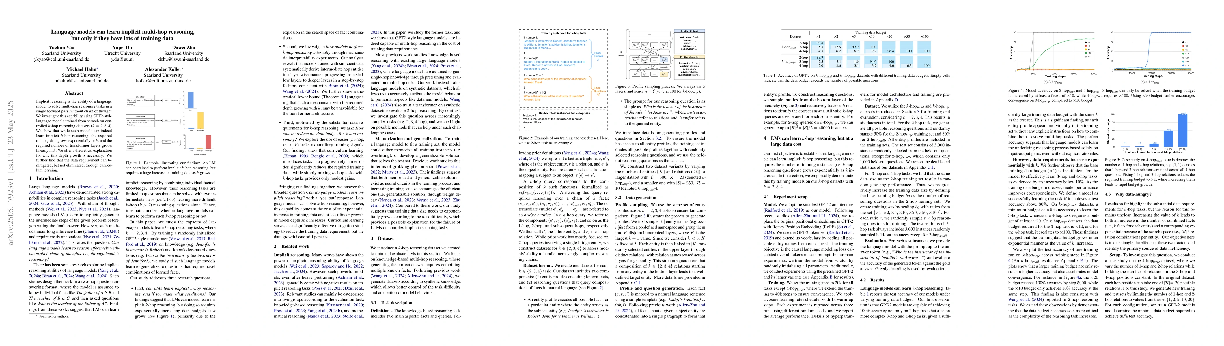 Unlike prior research that emphasizes chain-of-thought prompting, this work demonstrates implicit multi-hop reasoning capability in language models, revealing both its potential and data-intensive nature.
