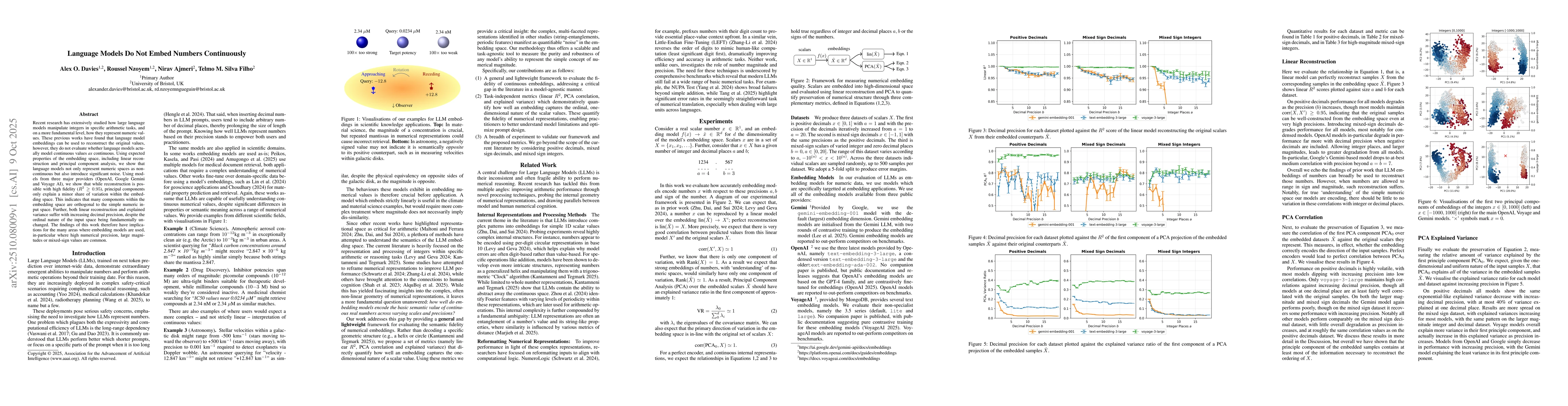 Introduces a framework combining linear reconstruction, PCA analysis, and variance explanation to evaluate the continuous representation of numeric values in language model embeddings.