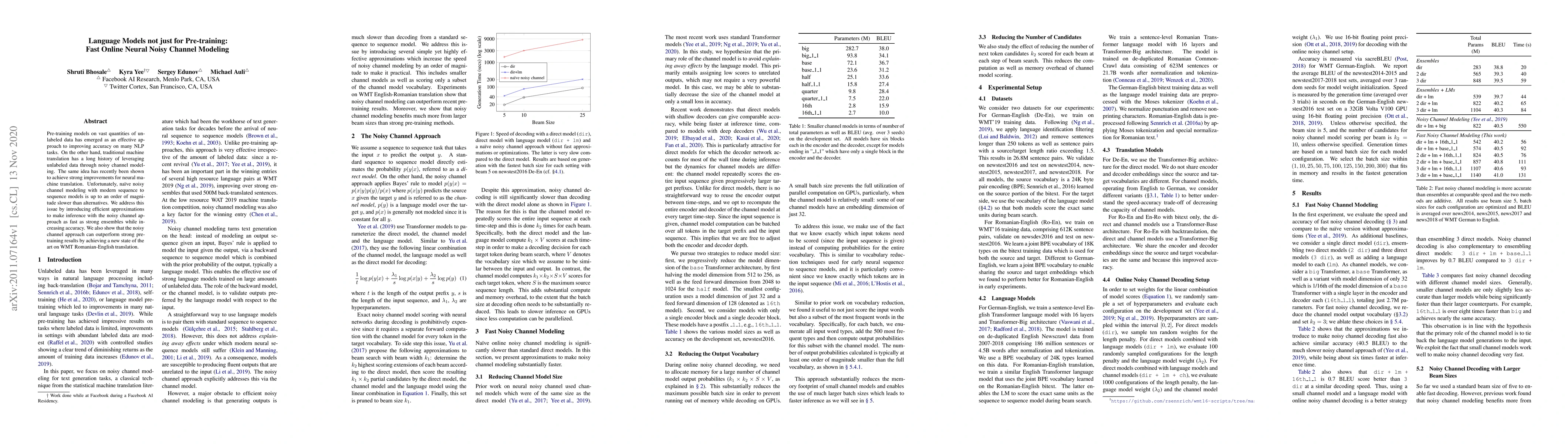 Pre-training models on vast quantities of unlabeled data has emerged as an effective approach to improving accuracy on many NLP tasks. On the other hand, traditional machine translation has a long history of leveraging unlabeled data through noisy channel modeling. The same idea has recently been shown to achieve strong improvements for neural machine translation. Unfortunately, na\"{i}ve noisy channel modeling with modern sequence to sequence models is up to an order of magnitude slower than alternatives. We address this issue by introducing efficient approximations to make inference with the noisy channel approach as fast as strong ensembles while increasing accuracy. We also show that the noisy channel approach can outperform strong pre-training results by achieving a new state of the art on WMT Romanian-English translation.