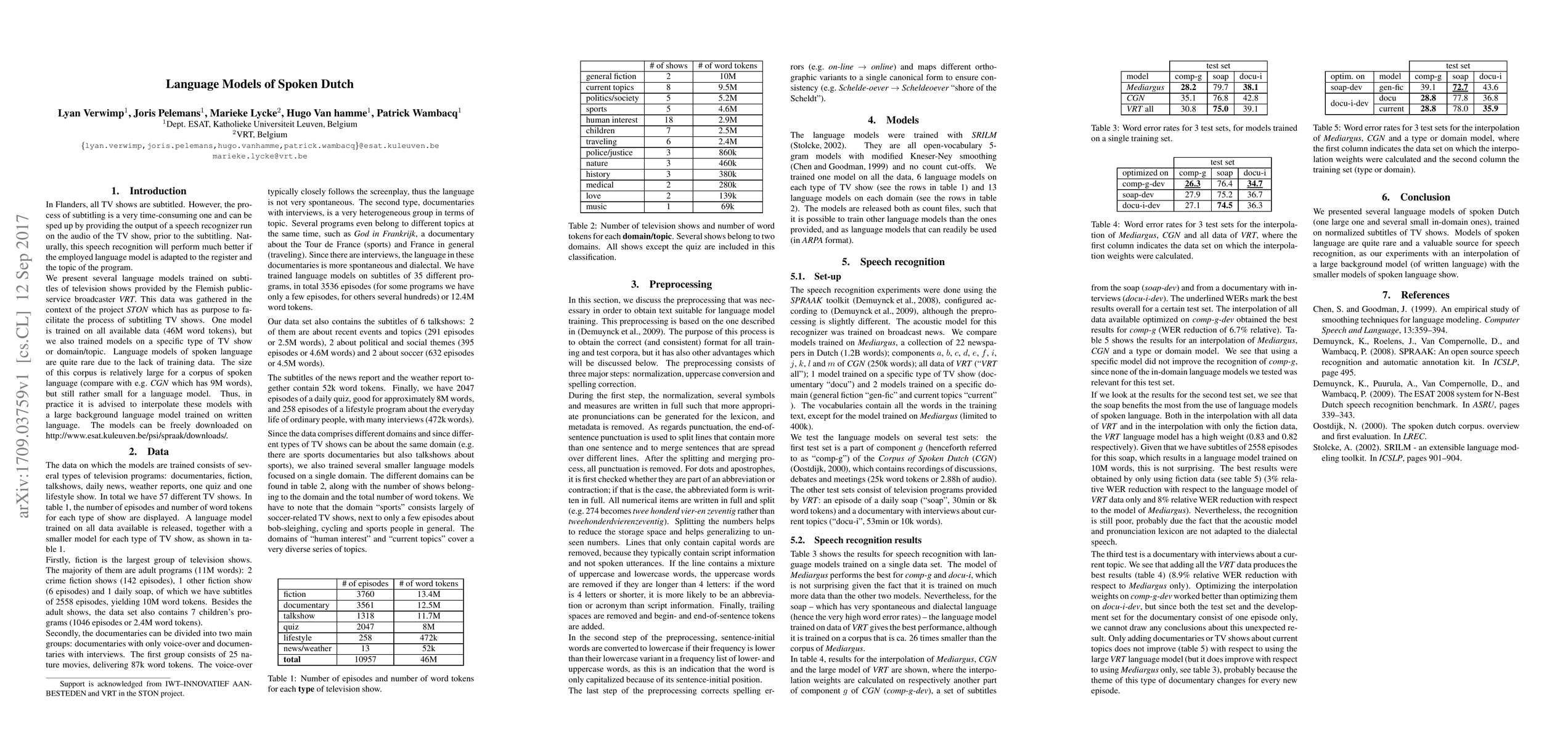 In Flanders, all TV shows are subtitled. However, the process of subtitling is a very time-consuming one and can be sped up by providing the output of a speech recognizer run on the audio of the TV show, prior to the subtitling. Naturally, this speech recognition will perform much better if the employed language model is adapted to the register and the topic of the program. We present several language models trained on subtitles of television shows provided by the Flemish public-service broadcaster VRT. This data was gathered in the context of the project STON which has as purpose to facilitate the process of subtitling TV shows. One model is trained on all available data (46M word tokens), but we also trained models on a specific type of TV show or domain/topic. Language models of spoken language are quite rare due to the lack of training data. The size of this corpus is relatively large for a corpus of spoken language (compare with e.g. CGN which has 9M words), but still rather small for a language model. Thus, in practice it is advised to interpolate these models with a large background language model trained on written language. The models can be freely downloaded on http://www.esat.kuleuven.be/psi/spraak/downloads/.