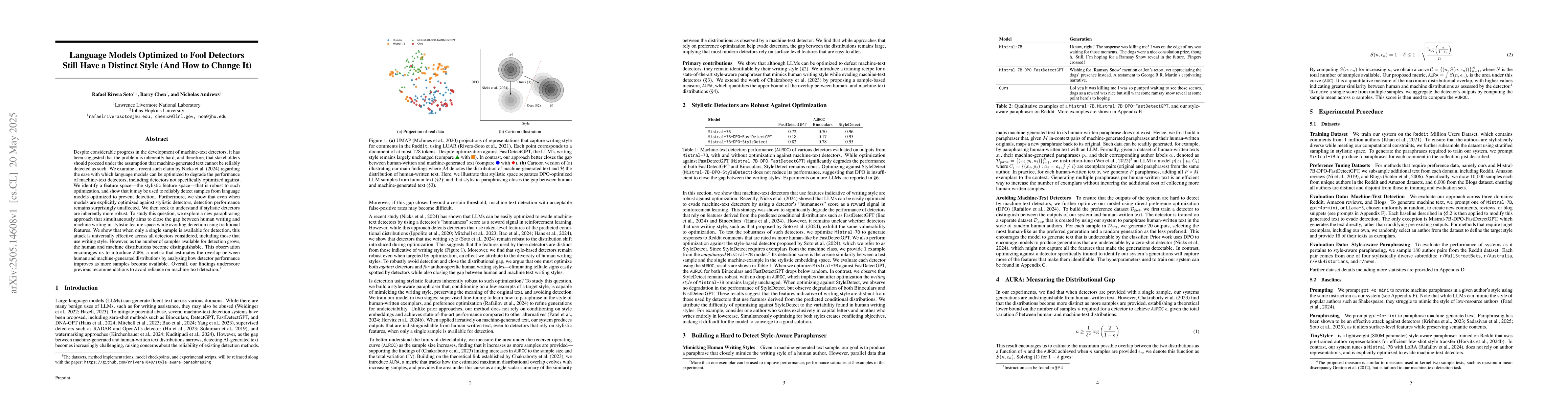 Researchers found that language models optimized to deceive detectors still retain a distinct style, which can be used for reliable detection. This study highlights the challenges of machine-text detection and encourages avoidance of reliance on such methods.