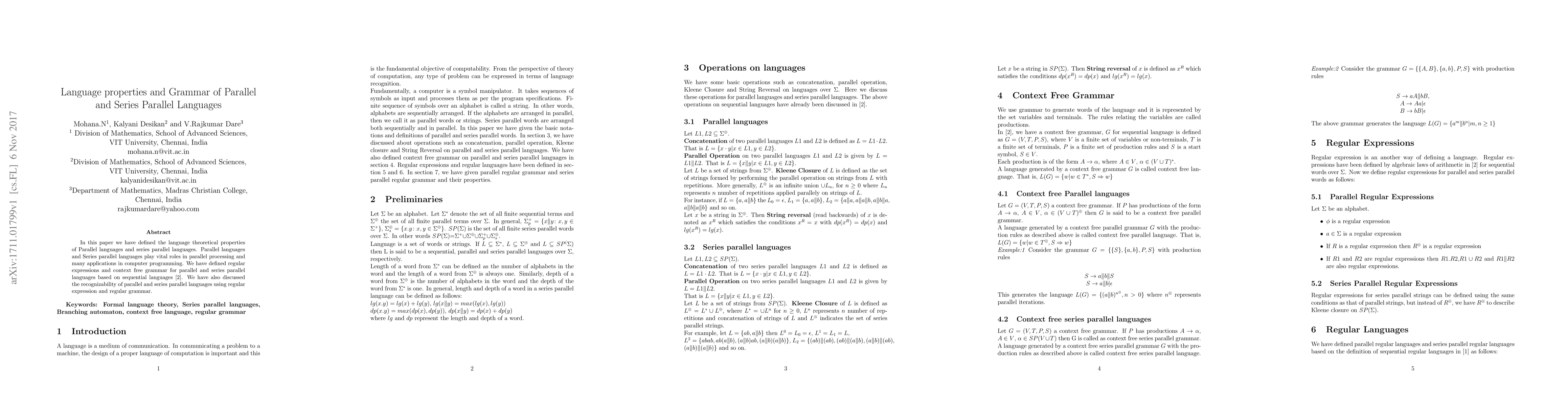 This paper defines the language theoretical properties of Parallel and Series Parallel languages, crucial for parallel processing in computer programming. It introduces regular expressions and context-free grammar for these languages and discusses their recognizability using regular expressions and regular grammar.