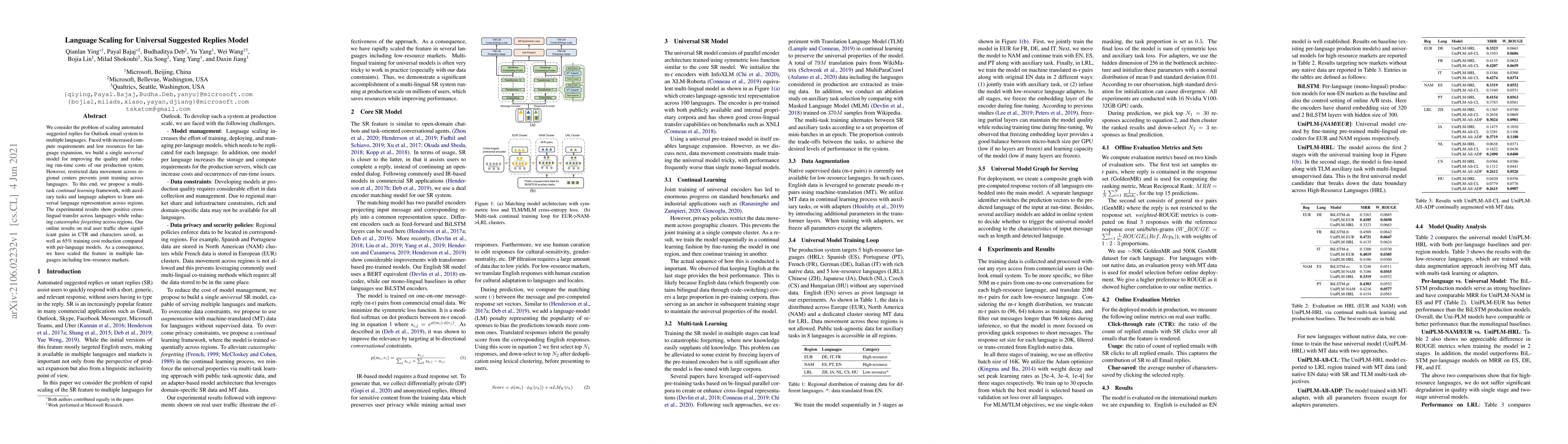 We consider the problem of scaling automated suggested replies for Outlook email system to multiple languages. Faced with increased compute requirements and low resources for language expansion, we build a single universal model for improving the quality and reducing run-time costs of our production system. However, restricted data movement across regional centers prevents joint training across languages. To this end, we propose a multi-task continual learning framework, with auxiliary tasks and language adapters to learn universal language representation across regions. The experimental results show positive cross-lingual transfer across languages while reducing catastrophic forgetting across regions. Our online results on real user traffic show significant gains in CTR and characters saved, as well as 65% training cost reduction compared with per-language models. As a consequence, we have scaled the feature in multiple languages including low-resource markets.