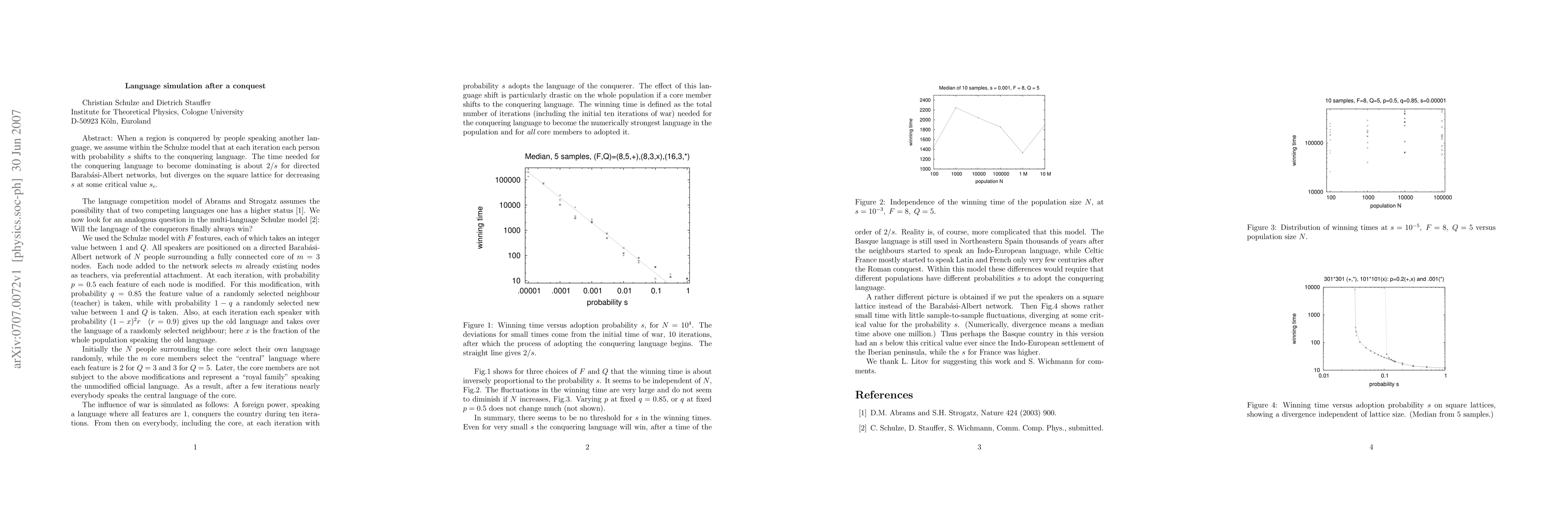 When a region is conquered by people speaking another language, we assume within the Schulze model that at each iteration each person with probability s shifts to the conquering language. The time needed for the conquering language to become dominating is about 2/s for directed Barabasi-Albert networks, but diverges on the square lattice for decreasing s at some critical value sc