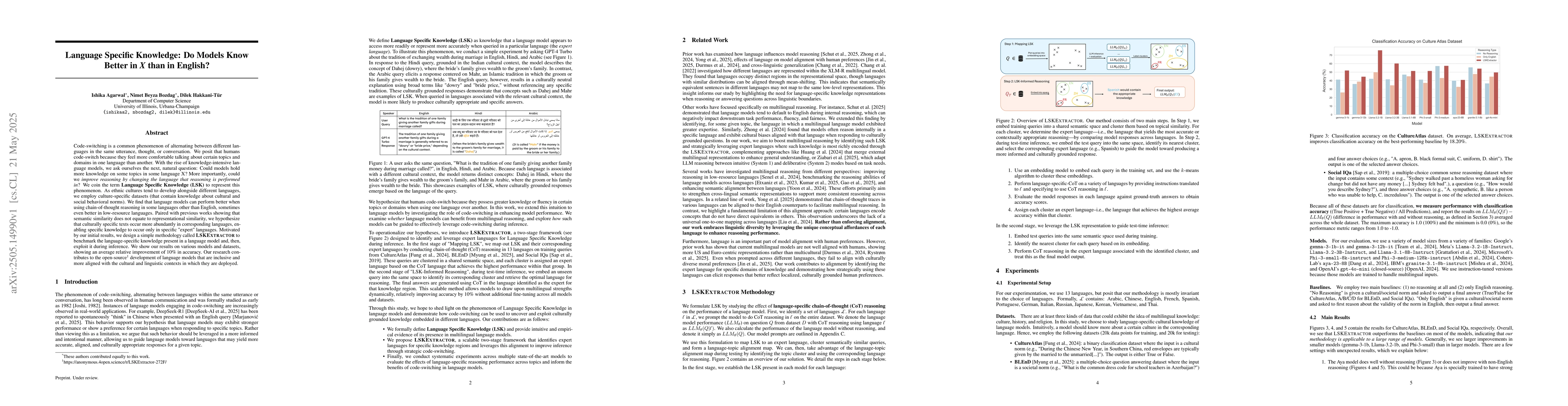 This work distinguishes itself by focusing on Language Specific Knowledge (LSK) in non-English languages, proposing a method (LSKExtractor) to measure and utilize this LSK, and demonstrating improvements in accuracy for specific topics in these languages.
