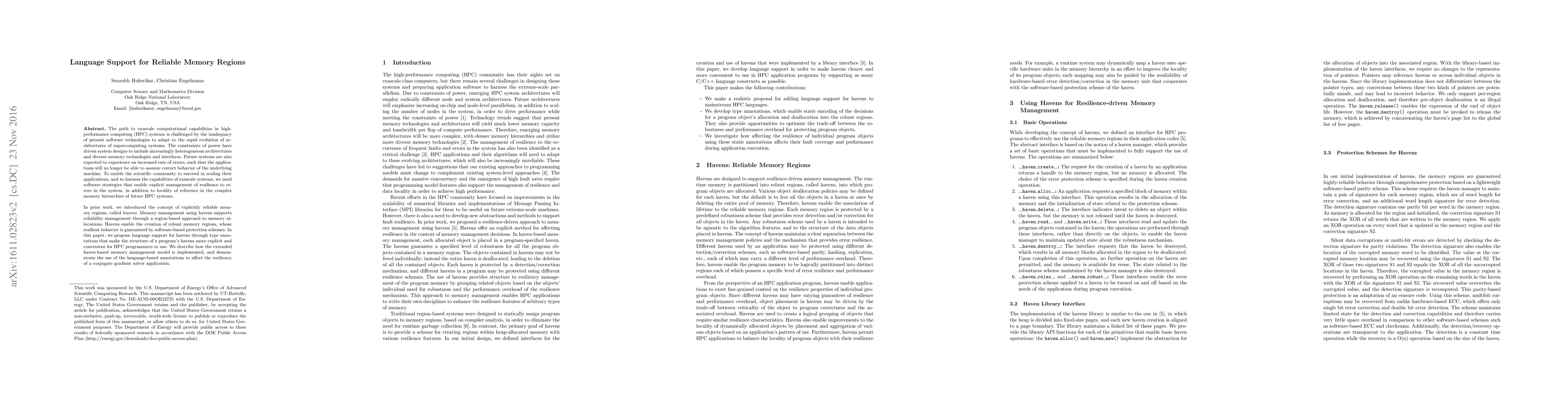 The path to exascale computational capabilities in high-performance computing (HPC) systems is challenged by the inadequacy of present software technologies to adapt to the rapid evolution of architectures of supercomputing systems. The constraints of power have driven system designs to include increasingly heterogeneous architectures and diverse memory technologies and interfaces. Future systems are also expected to experience an increased rate of errors, such that the applications will no longer be able to assume correct behavior of the underlying machine. To enable the scientific community to succeed in scaling their applications, and to harness the capabilities of exascale systems, we need software strategies that provide mechanisms for explicit management of resilience to errors in the system, in addition to locality of reference in the complex memory hierarchies of future HPC systems. In prior work, we introduced the concept of explicitly reliable memory regions, called havens. Memory management using havens supports reliability management through a region-based approach to memory allocations. Havens enable the creation of robust memory regions, whose resilient behavior is guaranteed by software-based protection schemes. In this paper, we propose language support for havens through type annotations that make the structure of a program's havens more explicit and convenient for HPC programmers to use. We describe how the extended haven-based memory management model is implemented, and demonstrate the use of the language-based annotations to affect the resiliency of a conjugate gradient solver application.