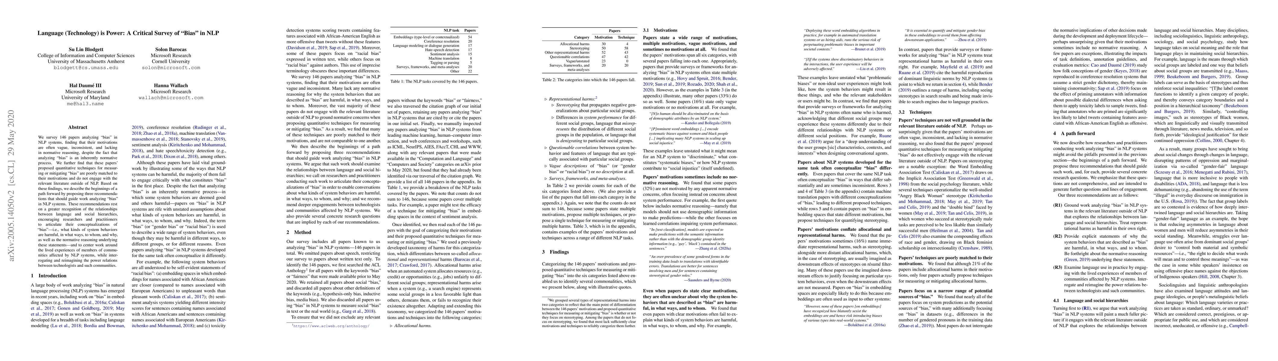 We survey 146 papers analyzing "bias" in NLP systems, finding that their motivations are often vague, inconsistent, and lacking in normative reasoning, despite the fact that analyzing "bias" is an inherently normative process. We further find that these papers' proposed quantitative techniques for measuring or mitigating "bias" are poorly matched to their motivations and do not engage with the relevant literature outside of NLP. Based on these findings, we describe the beginnings of a path forward by proposing three recommendations that should guide work analyzing "bias" in NLP systems. These recommendations rest on a greater recognition of the relationships between language and social hierarchies, encouraging researchers and practitioners to articulate their conceptualizations of "bias"---i.e., what kinds of system behaviors are harmful, in what ways, to whom, and why, as well as the normative reasoning underlying these statements---and to center work around the lived experiences of members of communities affected by NLP systems, while interrogating and reimagining the power relations between technologists and such communities.