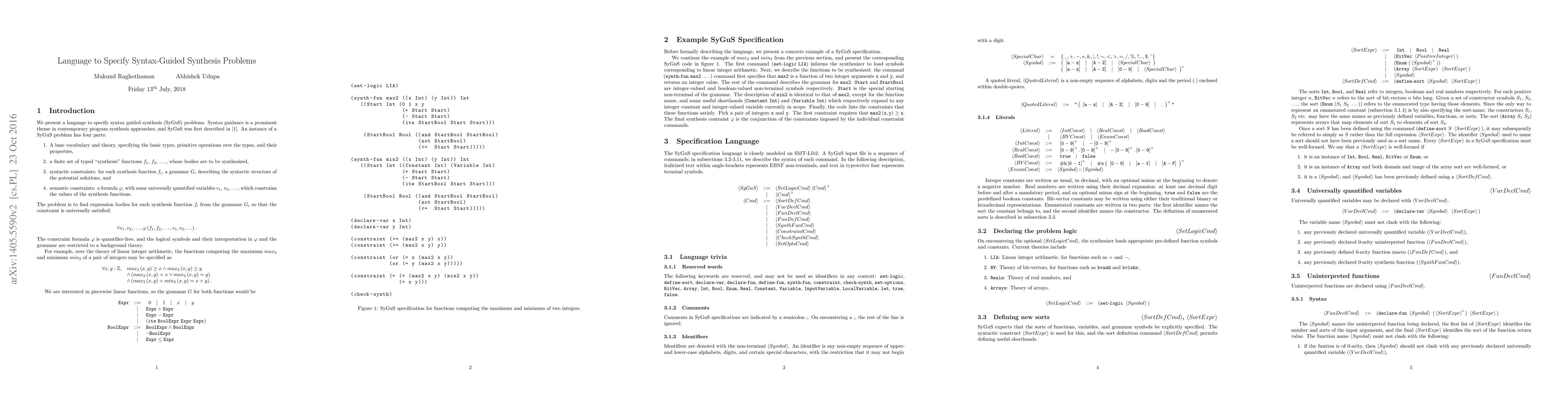 This paper introduces a language for specifying syntax-guided synthesis (SyGuS) problems, focusing on the input format for a SyGuS solver and detailing the syntax guidance approach in contemporary program synthesis methods. The paper references foundational work on SyGuS by Alur et al. (2013).
