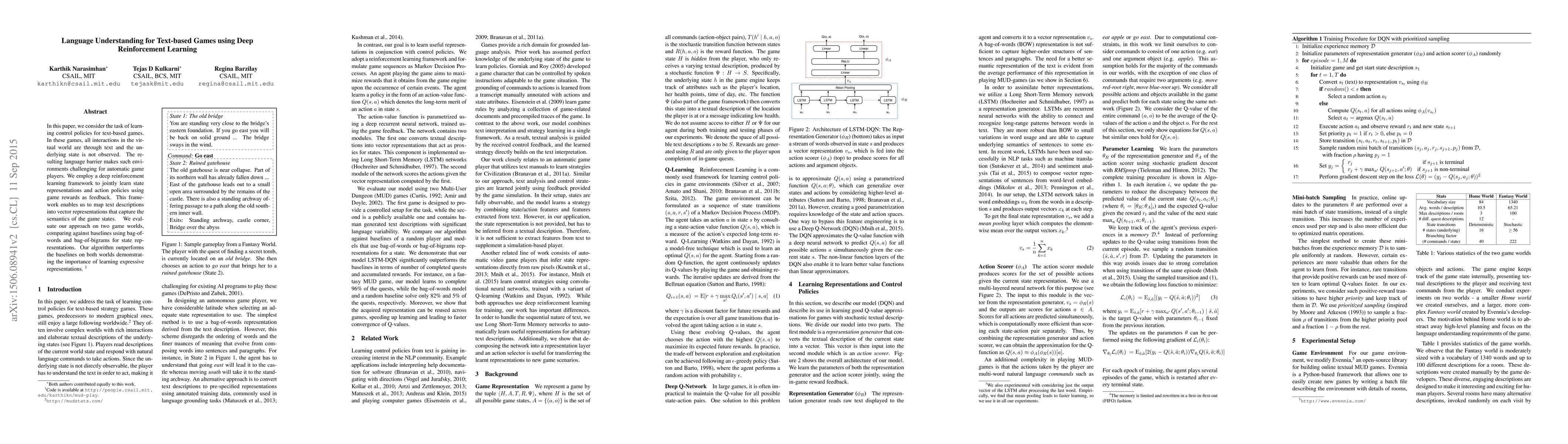 This paper explores deep reinforcement learning for controlling text-based games where state information is hidden. It employs a framework to learn state representations and action policies, outperforming baselines that use simpler text representations.
