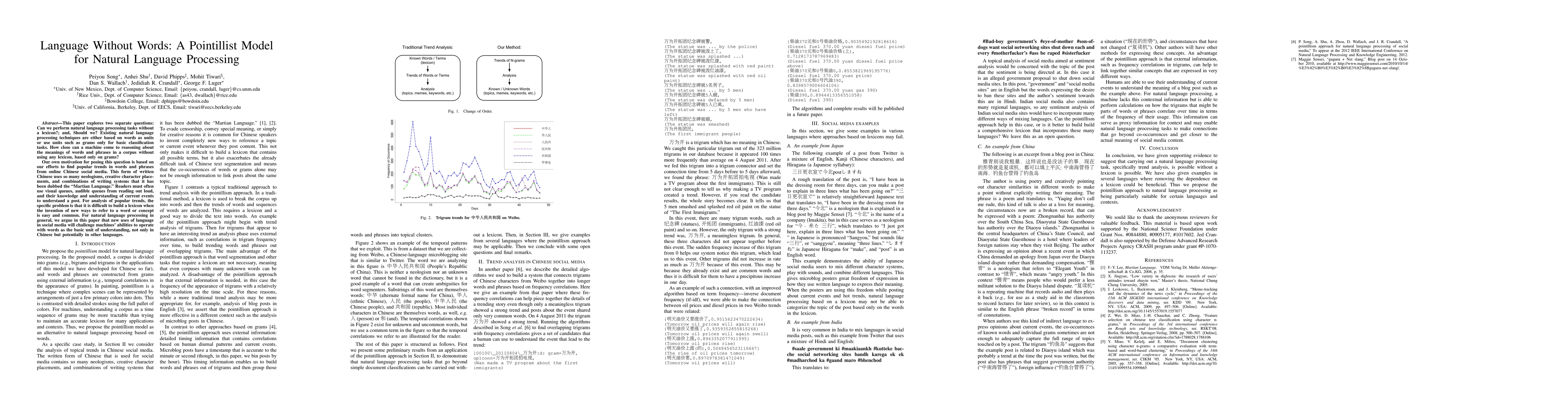 This paper investigates the feasibility of performing natural language processing tasks without a lexicon, focusing on whether machines can reason about word meanings using only grams. The authors argue that the rapid evolution of language in online Chinese social media, characterized by frequent neologisms and unconventional character combinations, challenges traditional lexicon-based NLP methods.