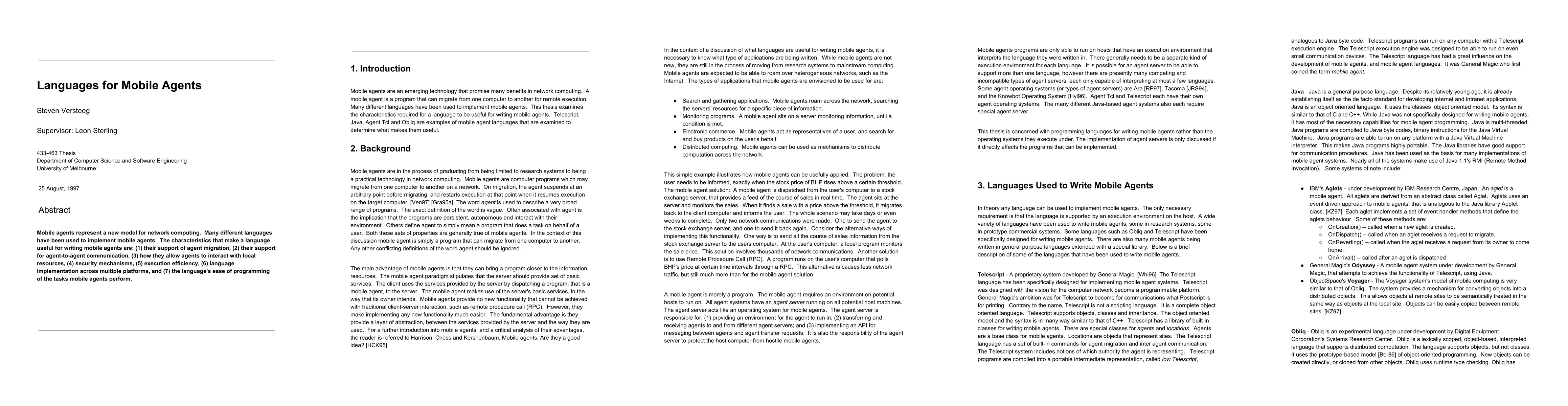 Mobile agents represent a new model for network computing. Many different languages have been used to implement mobile agents. The characteristics that make a language useful for writing mobile agents are: (1) their support of agent migration, (2) their support for agent-to-agent communication, (3) how they allow agents to interact with local resources, (4) security mechanisms, (5) execution efficiency, (6) language implementation across multiple platforms, and (7) the language's ease of programming of the tasks mobile agents perform.