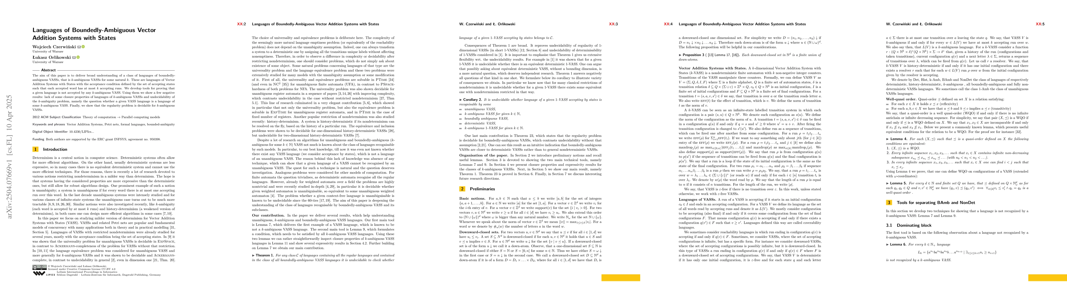 The paper employs the development of tools and proof techniques to analyze boundedly-ambiguous Vector Addition Systems with States (VASS) and establish properties of the languages they accept.