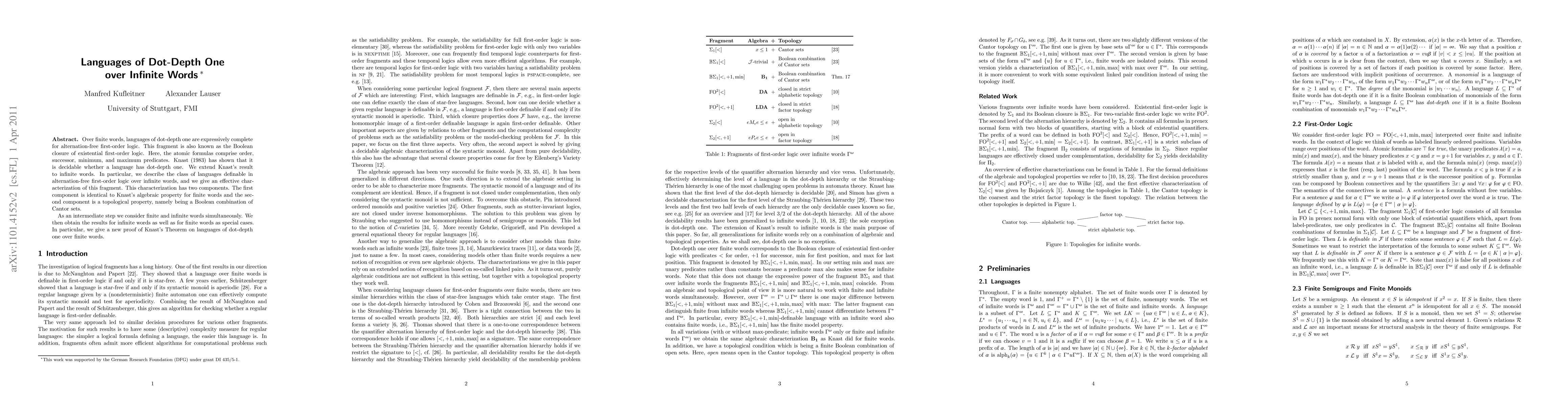 The research extends Knast's result on dot-depth one languages to infinite words, characterizing the class of languages definable in alternation-free first-order logic over infinite words using both algebraic and topological properties.