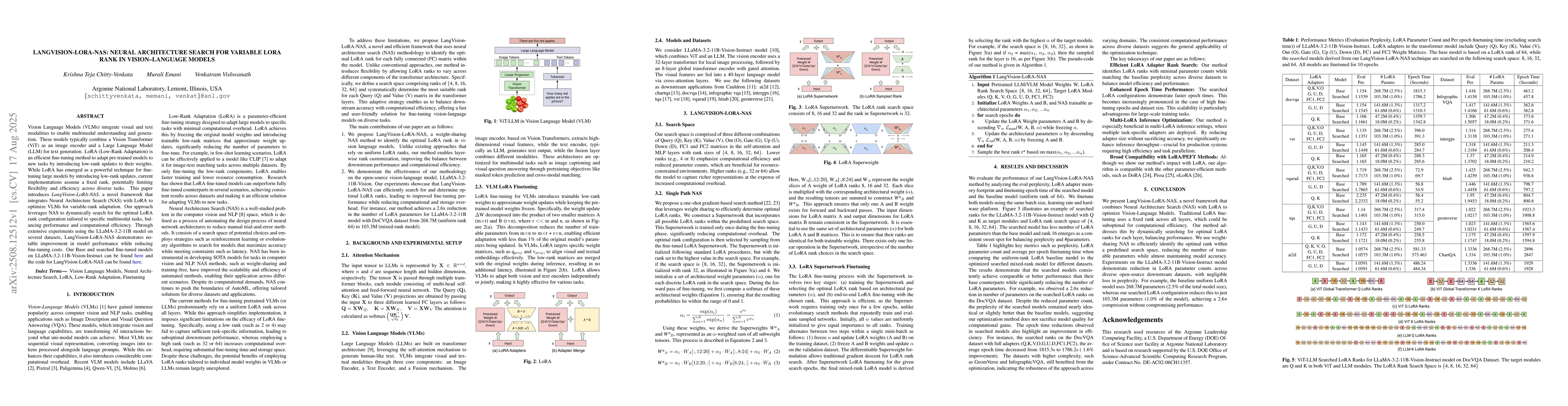 Vision Language Models (VLMs) integrate visual and text modalities to enable multimodal understanding and generation. These models typically combine a Vision Transformer (ViT) as an image encoder and a Large Language Model (LLM) for text generation. LoRA (Low-Rank Adaptation) is an efficient fine-tuning method to adapt pre-trained models to new tasks by introducing low-rank updates to their weights. While LoRA has emerged as a powerful technique for fine-tuning large models by introducing low-rank updates, current implementations assume a fixed rank, potentially limiting flexibility and efficiency across diverse tasks. This paper introduces \textit{LangVision-LoRA-NAS}, a novel framework that integrates Neural Architecture Search (NAS) with LoRA to optimize VLMs for variable-rank adaptation. Our approach leverages NAS to dynamically search for the optimal LoRA rank configuration tailored to specific multimodal tasks, balancing performance and computational efficiency. Through extensive experiments using the LLaMA-3.2-11B model on several datasets, LangVision-LoRA-NAS demonstrates notable improvement in model performance while reducing fine-tuning costs. Our Base and searched fine-tuned models on LLaMA-3.2-11B-Vision-Instruct can be found \href{https://huggingface.co/collections/krishnateja95/llama-32-11b-vision-instruct-langvision-lora-nas-6786cac480357a6a6fcc59ee}{\textcolor{blue}{here}} and the code for LangVision-LoRA-NAS can be found \href{https://github.com/krishnateja95/LangVision-NAS}{\textcolor{blue}{here}}.