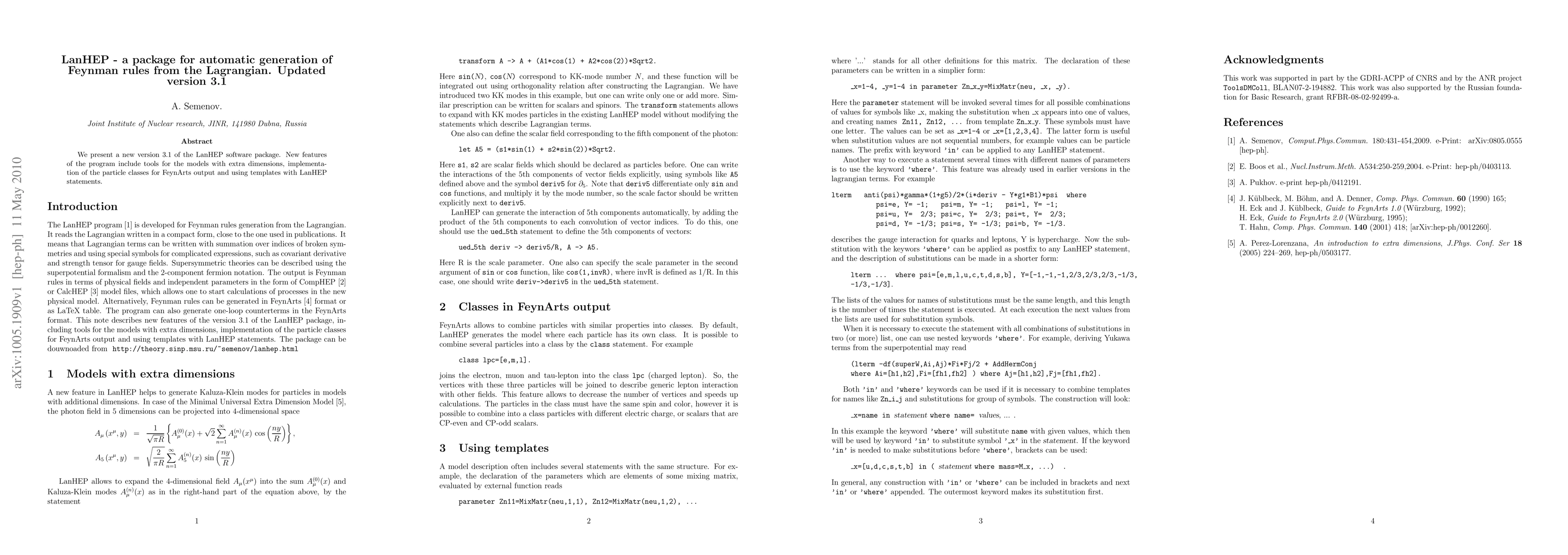We present a new version 3.1 of the LanHEP software package. New features of the program include tools for the models with extra dimensions, implementation of the particle classes for FeynArts output and using templates with LanHEP statements.