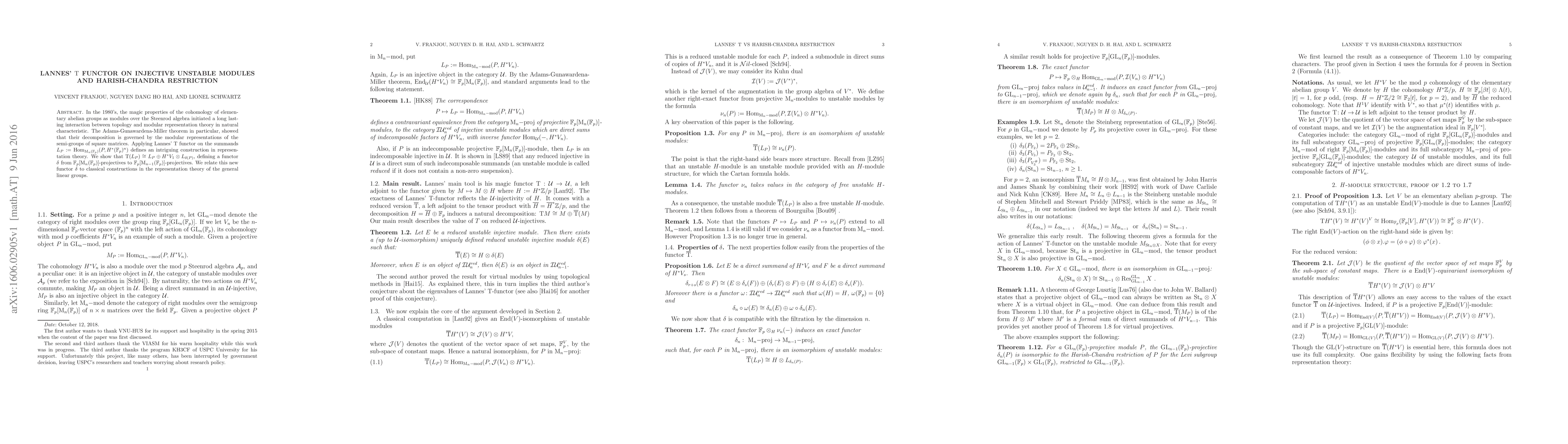 The paper explores the application of Lannes' T functor on injective unstable modules, showing that T(LP) is isomorphic to LP ⊕ H*V1 ⊗ Lδ(P), establishing a new functor δ. It relates this construction to classical representation theory of general linear groups.