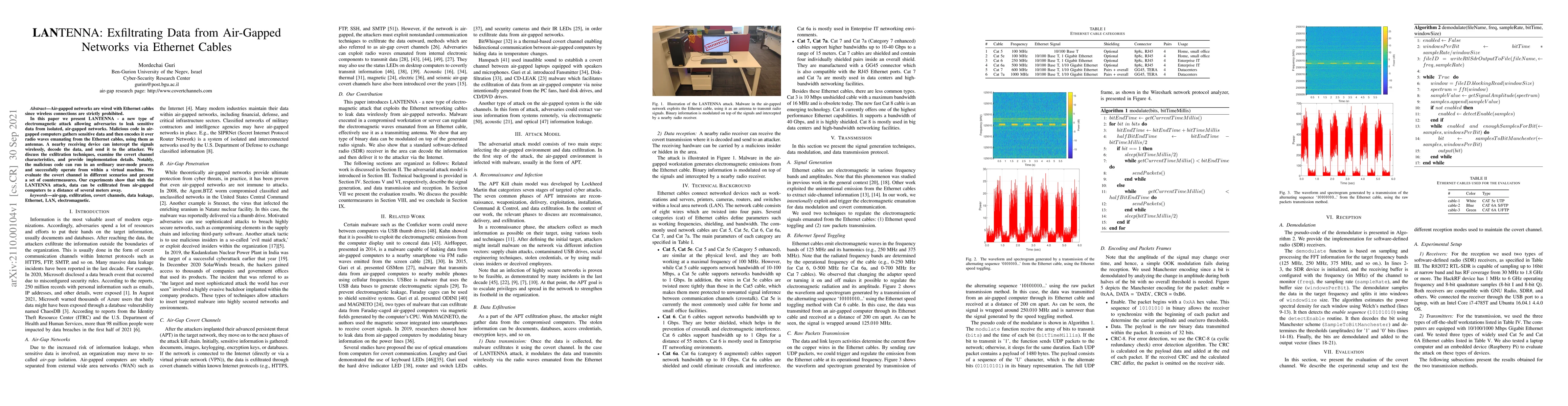 This paper introduces LANTENNA, an electromagnetic attack exploiting Ethernet cables to exfiltrate data from air-gapped networks. The attack encodes data over radio waves transmitted via Ethernet cables, allowing a nearby receiver to intercept and decode the data, demonstrating successful operation even within virtual machines.