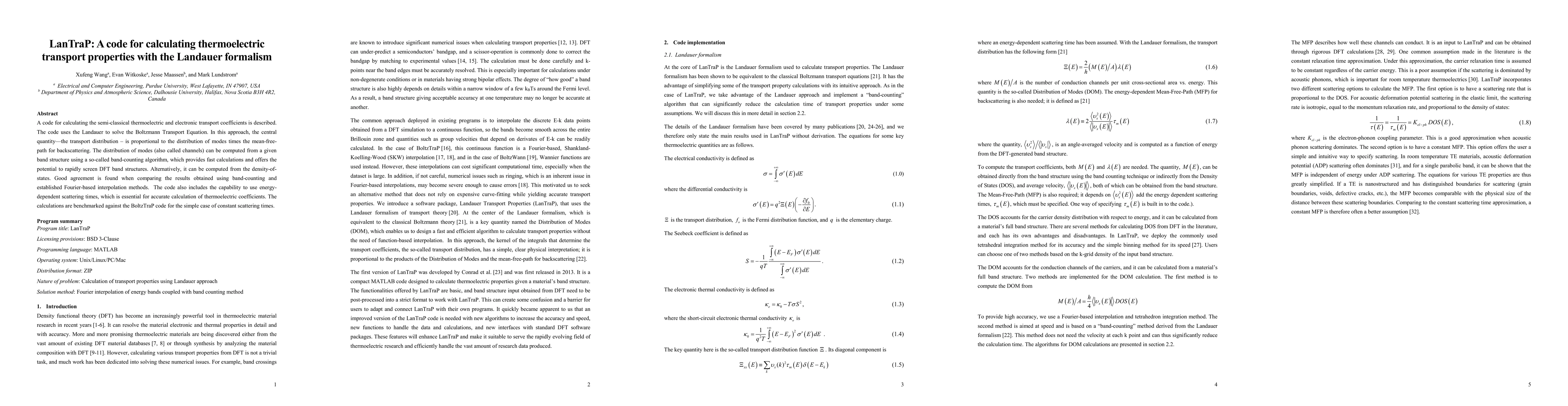 A code for calculating the semi-classical thermoelectric and electronic transport properties is described. It uses the Landauer transport theory, which is equivalent to the Boltzmann theory, by introducing a central quantity-the distribution of modes. Its usage enables the so-called band-counting algorithm that can speed up the calculation and offers the potential to rapidly screen DFT band structures. Good agreements are found when comparing the results obtained using band-counting and established Fourier-based interpolation methods.