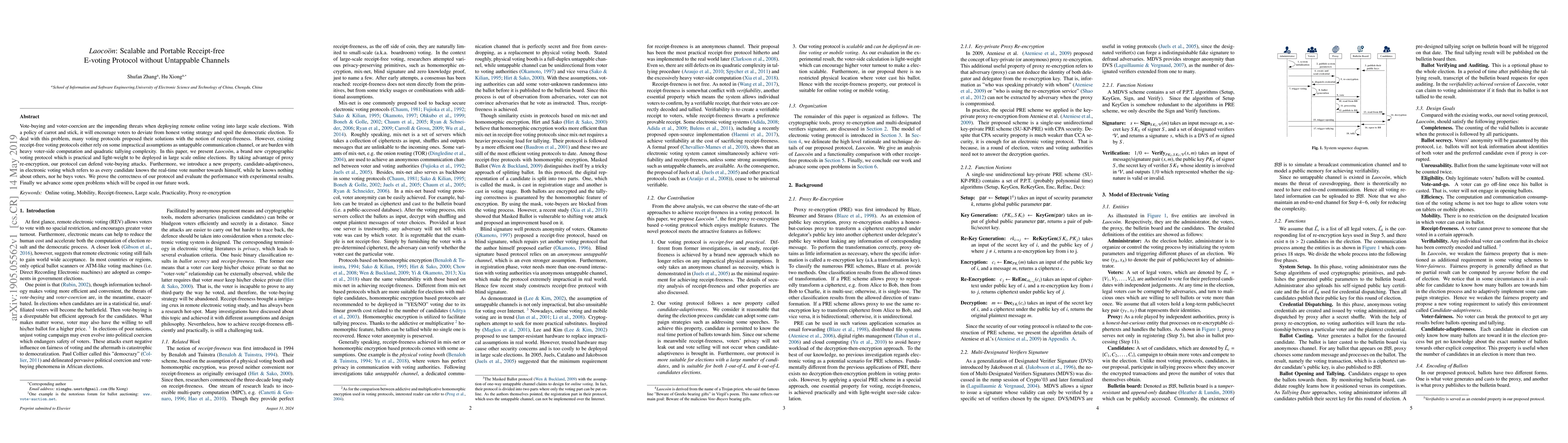 The $Laoco\ddot{o}n$ protocol presents a scalable and portable receipt-free e-voting system that defends against vote-buying attacks using proxy re-encryption, while maintaining candidate-adaptiveness without relying on untappable channels. The protocol's efficiency and correctness are demonstrated through experimental evaluations.