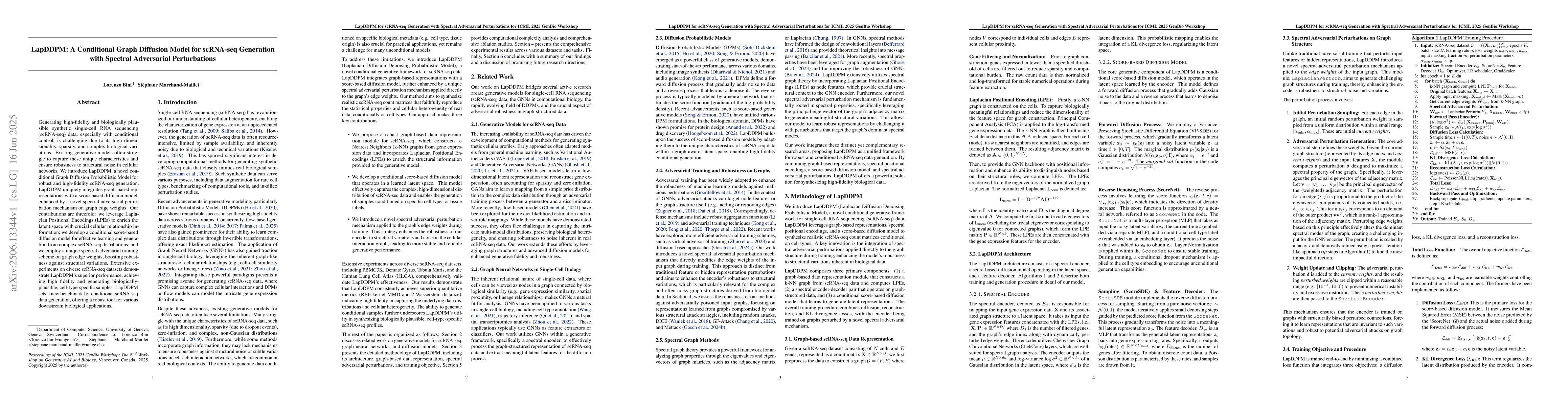 Generating high-fidelity and biologically plausible synthetic single-cell RNA sequencing (scRNA-seq) data, especially with conditional control, is challenging due to its high dimensionality, sparsity, and complex biological variations. Existing generative models often struggle to capture these unique characteristics and ensure robustness to structural noise in cellular networks. We introduce LapDDPM, a novel conditional Graph Diffusion Probabilistic Model for robust and high-fidelity scRNA-seq generation. LapDDPM uniquely integrates graph-based representations with a score-based diffusion model, enhanced by a novel spectral adversarial perturbation mechanism on graph edge weights. Our contributions are threefold: we leverage Laplacian Positional Encodings (LPEs) to enrich the latent space with crucial cellular relationship information; we develop a conditional score-based diffusion model for effective learning and generation from complex scRNA-seq distributions; and we employ a unique spectral adversarial training scheme on graph edge weights, boosting robustness against structural variations. Extensive experiments on diverse scRNA-seq datasets demonstrate LapDDPM's superior performance, achieving high fidelity and generating biologically-plausible, cell-type-specific samples. LapDDPM sets a new benchmark for conditional scRNA-seq data generation, offering a robust tool for various downstream biological applications.