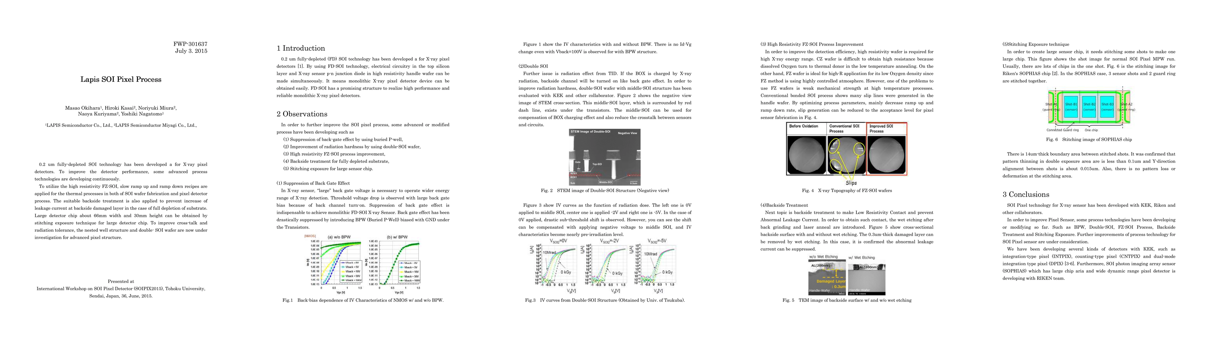 0.2 um fully-depleted SOI technology has been developed a for X-ray pixel detectors. To improve the detector performance, some advanced process technologies are developing continuously. To utilize the high resistivity FZ-SOI, slow ramp up and ramp down recipes are applied for the thermal processes in both of SOI wafer fabrication and pixel detector process. The suitable backside treatment is also applied to prevent increase of leakage current at backside damaged layer in the case of full depletion of substrate. Large detector chip about 66mm width and 30mm height can be obtained by stitching exposure technique for large detector chip. To improve cross-talk and radiation tolerance, the nested well structure and double- SOI wafer are now under investigation for advanced pixel structure.