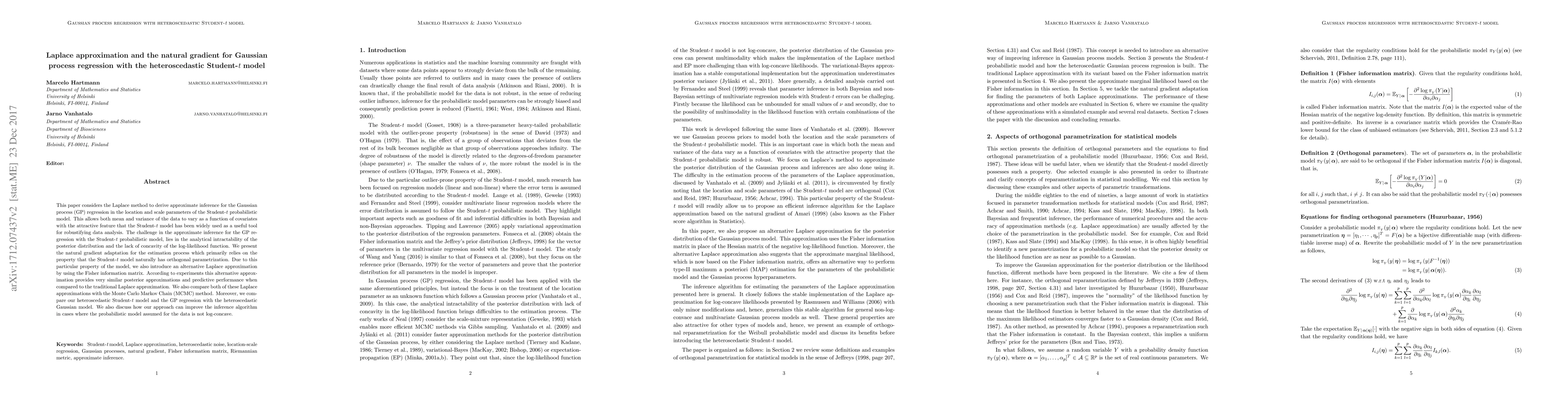 This paper uses the Laplace method to derive approximate inference for Gaussian process regression in a heteroscedastic Student-t model, addressing the analytical intractability of the posterior distribution. It introduces a natural gradient adaptation and an alternative Laplace approximation using the Fisher information matrix, showing comparable performance to traditional methods and Monte Carlo Markov Chain.