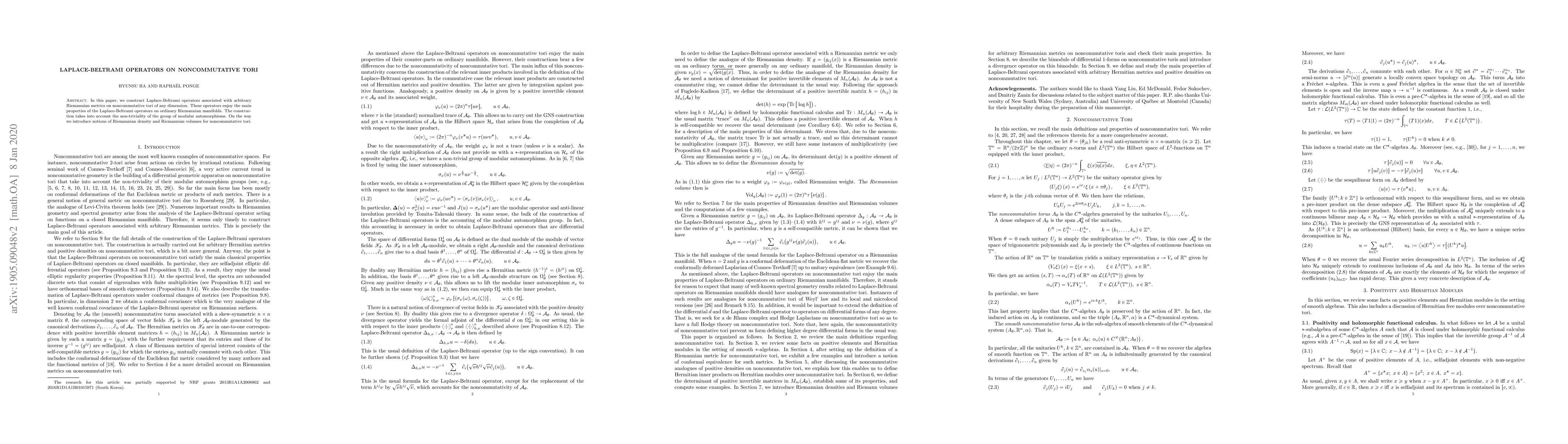 This paper constructs Laplace-Beltrami operators on noncommutative tori under arbitrary Riemannian metrics, ensuring they retain properties analogous to those on ordinary manifolds. The construction respects the modular automorphisms' non-triviality and introduces concepts of Riemannian density and volumes for these noncommutative spaces.