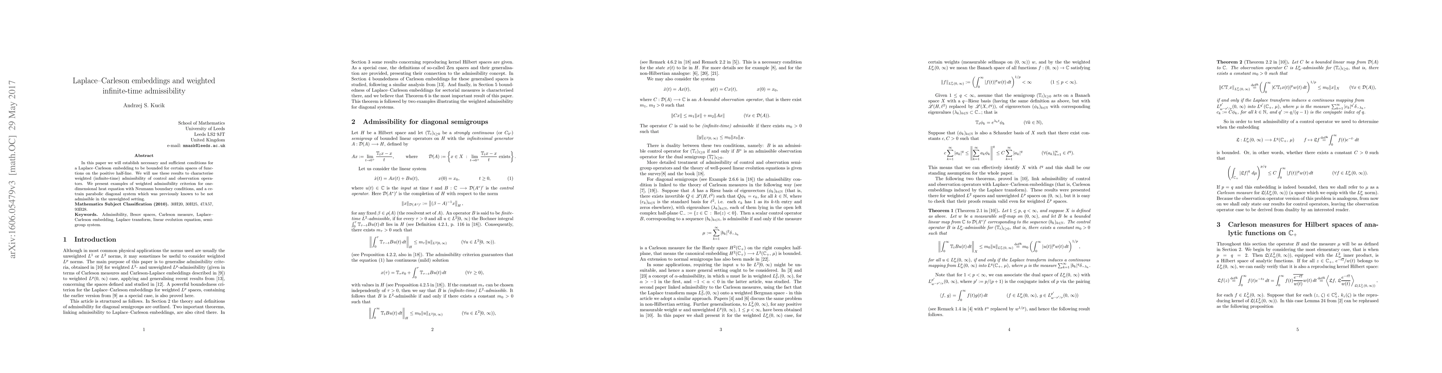Summary: This paper establishes necessary and sufficient conditions for Laplace-Carleson embeddings to be bounded for specific function spaces on the positive half-line, and uses these conditions to characterize weighted infinite-time admissibility of control and observation operators.