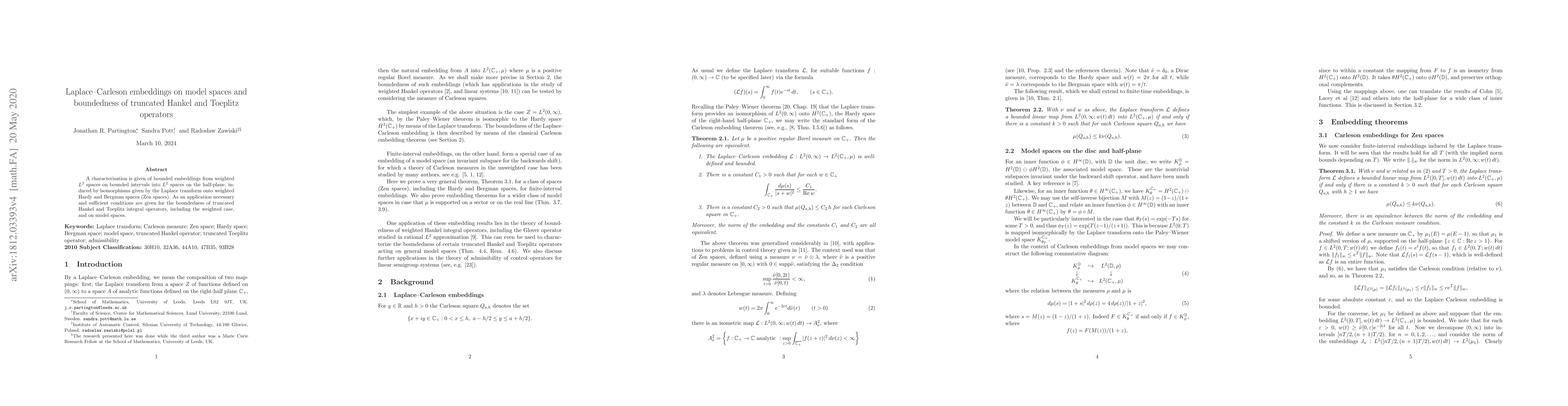 A characterisation is given of bounded embeddings from weighted $L^2$ spaces on bounded intervals into $L^2$ spaces on the half-plane, induced by isomorphisms given by the Laplace transform onto weighted Hardy and Bergman spaces (Zen spaces). As an application necessary and sufficient conditions are given for the boundedness of truncated Hankel and Toeplitz integral operators, including the weighted case.
