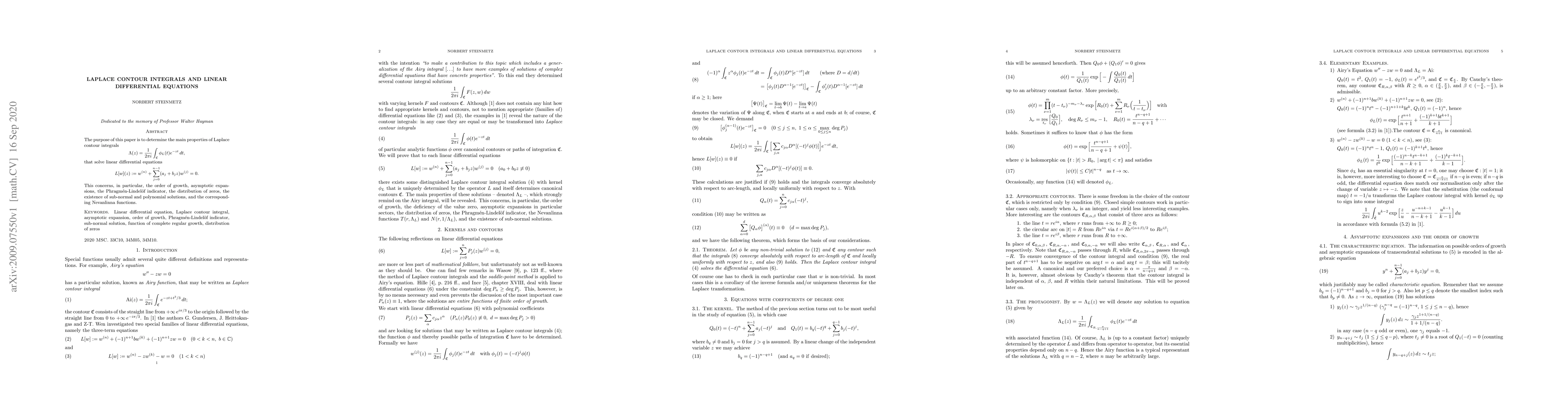 This paper investigates properties of Laplace contour integrals that solve linear differential equations, including order of growth, asymptotic expansions, and distribution of zeros.