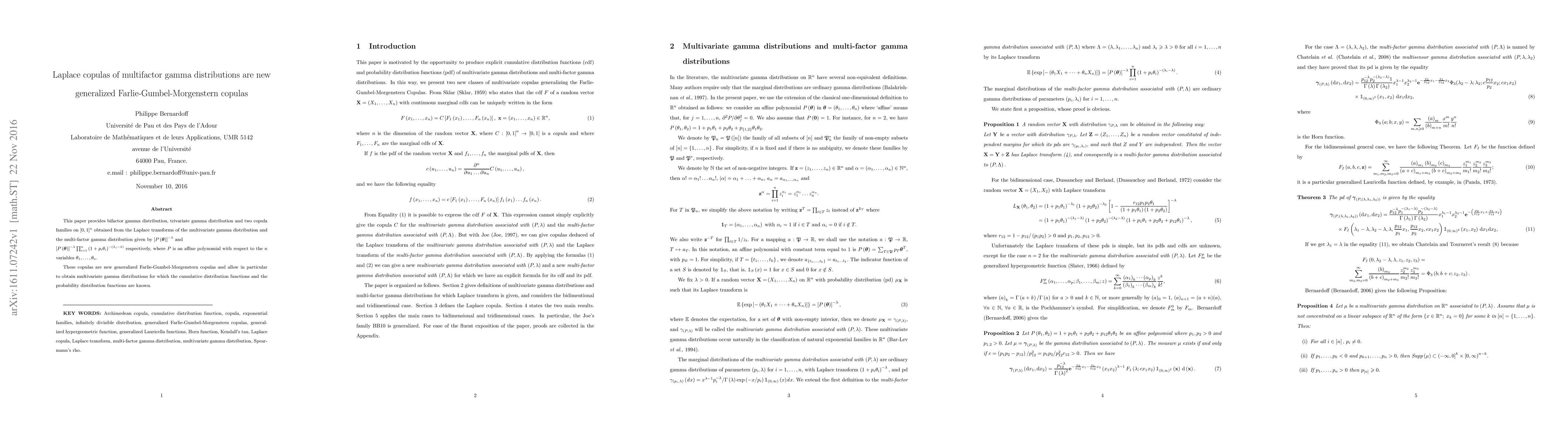 This paper introduces new generalized Farlie-Gumbel-Morgenstern copulas derived from Laplace transforms of multifactor gamma distributions, providing bifactor and trivariate gamma distributions with known cumulative and probability distribution functions.