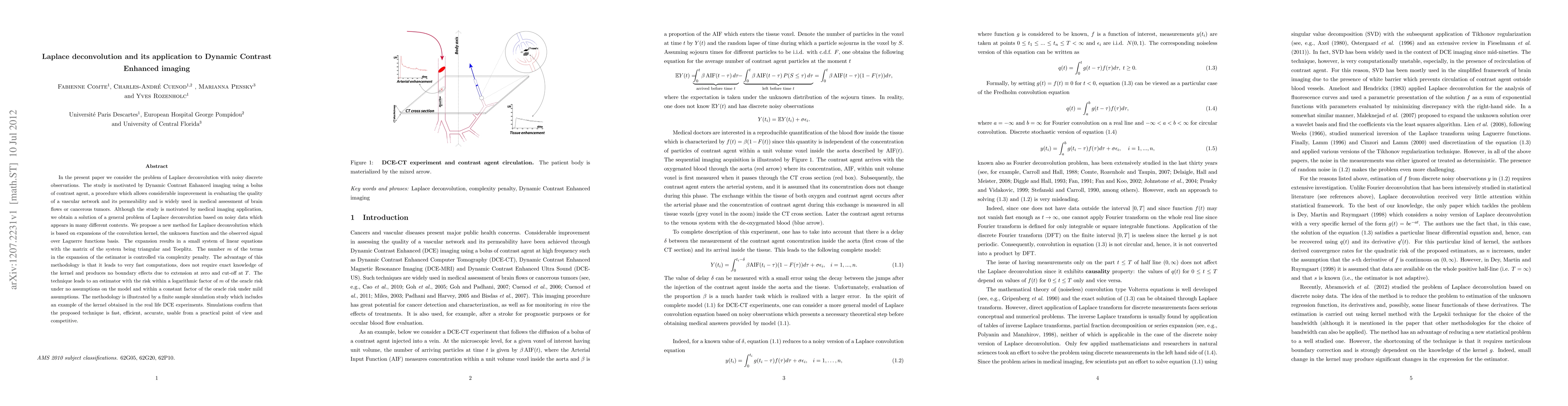 In the present paper we consider the problem of Laplace deconvolution with noisy discrete observations. The study is motivated by Dynamic Contrast Enhanced imaging using a bolus of contrast agent, a procedure which allows considerable improvement in {evaluating} the quality of a vascular network and its permeability and is widely used in medical assessment of brain flows or cancerous tumors. Although the study is motivated by medical imaging application, we obtain a solution of a general problem of Laplace deconvolution based on noisy data which appears in many different contexts. We propose a new method for Laplace deconvolution which is based on expansions of the convolution kernel, the unknown function and the observed signal over Laguerre functions basis. The expansion results in a small system of linear equations with the matrix of the system being triangular and Toeplitz. The number $m$ of the terms in the expansion of the estimator is controlled via complexity penalty. The advantage of this methodology is that it leads to very fast computations, does not require exact knowledge of the kernel and produces no boundary effects due to extension at zero and cut-off at $T$. The technique leads to an estimator with the risk within a logarithmic factor of $m$ of the oracle risk under no assumptions on the model and within a constant factor of the oracle risk under mild assumptions. The methodology is illustrated by a finite sample simulation study which includes an example of the kernel obtained in the real life DCE experiments. Simulations confirm that the proposed technique is fast, efficient, accurate, usable from a practical point of view and competitive.