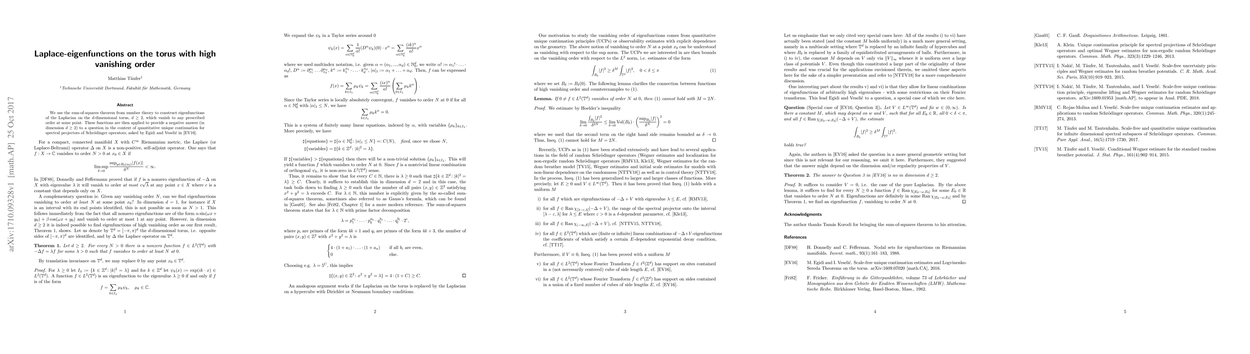 We use the sum-of-squares theorem from number theory to construct eigenfunctions of the Laplacian on the $d$-dimensional torus, $d \geq 2$, which vanish to any prescribed order at some point. These functions are then applied to provide a negative answer (in dimension $d \geq 2$) to a question in the context of quantitative unique continuation for spectral projectors of Schr\"odinger operators, asked by Egidi and Veseli\'c.