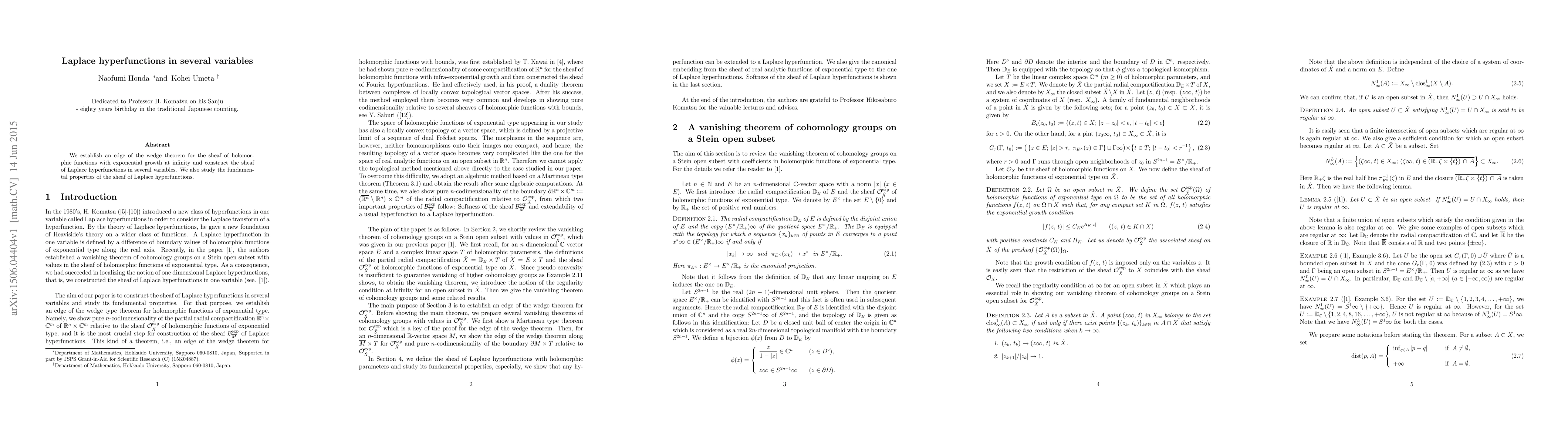 This paper establishes an edge of the wedge theorem for holomorphic functions with exponential growth and constructs the sheaf of Laplace hyperfunctions in several variables, while also exploring their fundamental properties.