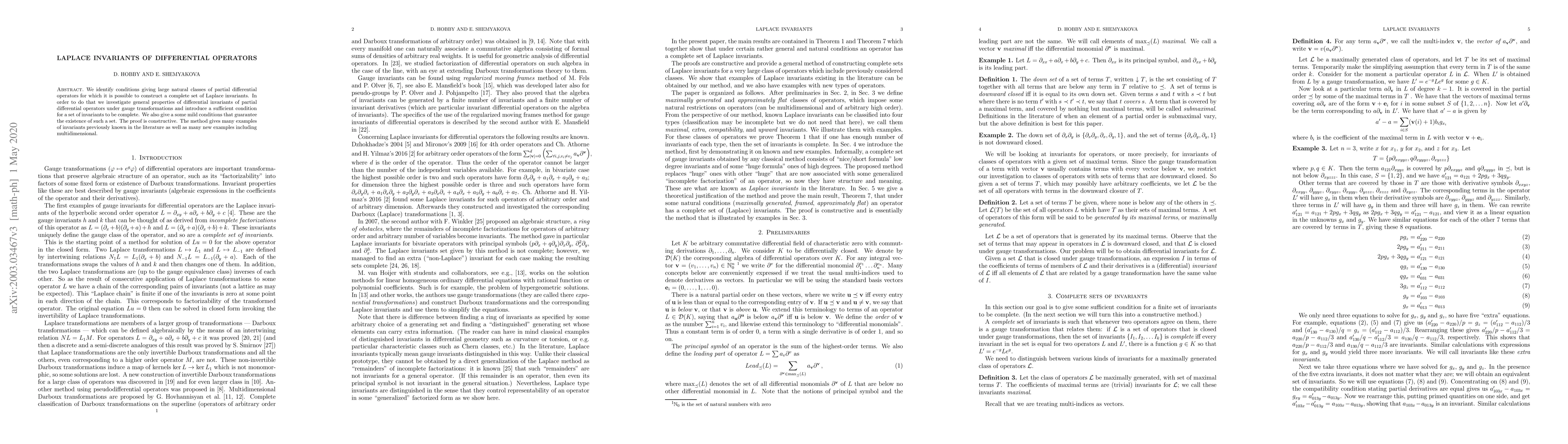 We identify conditions giving large natural classes of partial differential operators for which it is possible to construct a complete set of Laplace invariants. In order to do that we investigate general properties of differential invariants of partial differential operators under gauge transformations and introduce a sufficient condition for a set of invariants to be complete. We also give a some mild conditions that guarantee the existence of such a set. The proof is constructive. The method gives many examples of invariants previously known in the literature as well as many new examples including multidimensional.