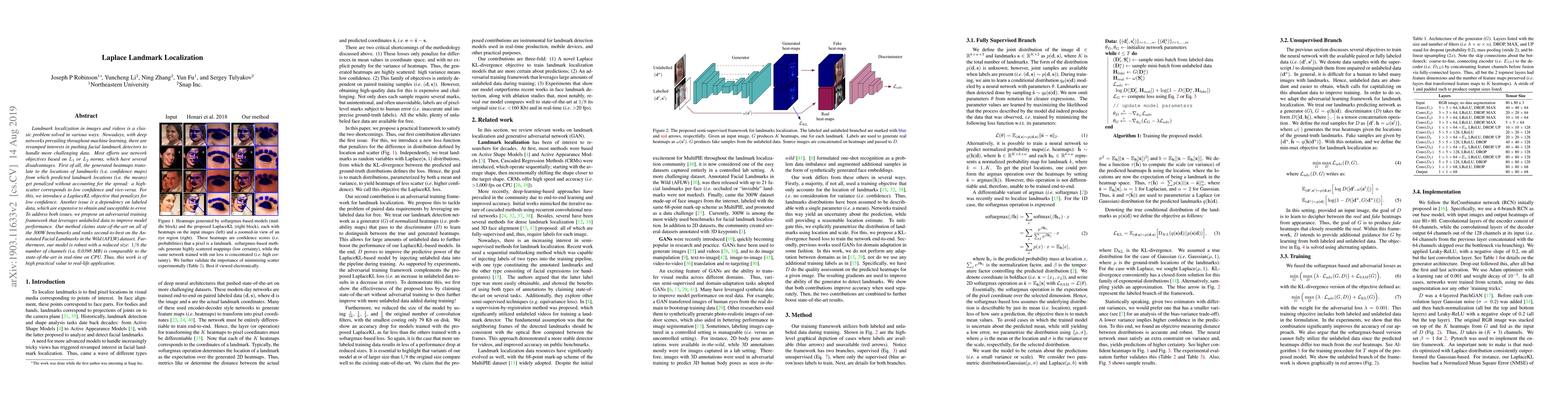 Landmark localization in images and videos is a classic problem solved in various ways. Nowadays, with deep networks prevailing throughout machine learning, there are revamped interests in pushing facial landmark detection technologies to handle more challenging data. Most efforts use network objectives based on L1 or L2 norms, which have several disadvantages. First of all, the locations of landmarks are determined from generated heatmaps (i.e., confidence maps) from which predicted landmark locations (i.e., the means) get penalized without accounting for the spread: a high scatter corresponds to low confidence and vice-versa. For this, we introduce a LaplaceKL objective that penalizes for a low confidence. Another issue is a dependency on labeled data, which are expensive to obtain and susceptible to error. To address both issues we propose an adversarial training framework that leverages unlabeled data to improve model performance. Our method claims state-of-the-art on all of the 300W benchmarks and ranks second-to-best on the Annotated Facial Landmarks in the Wild (AFLW) dataset. Furthermore, our model is robust with a reduced size: 1/8 the number of channels (i.e., 0.0398MB) is comparable to state-of-that-art in real-time on CPU. Thus, we show that our method is of high practical value to real-life application.