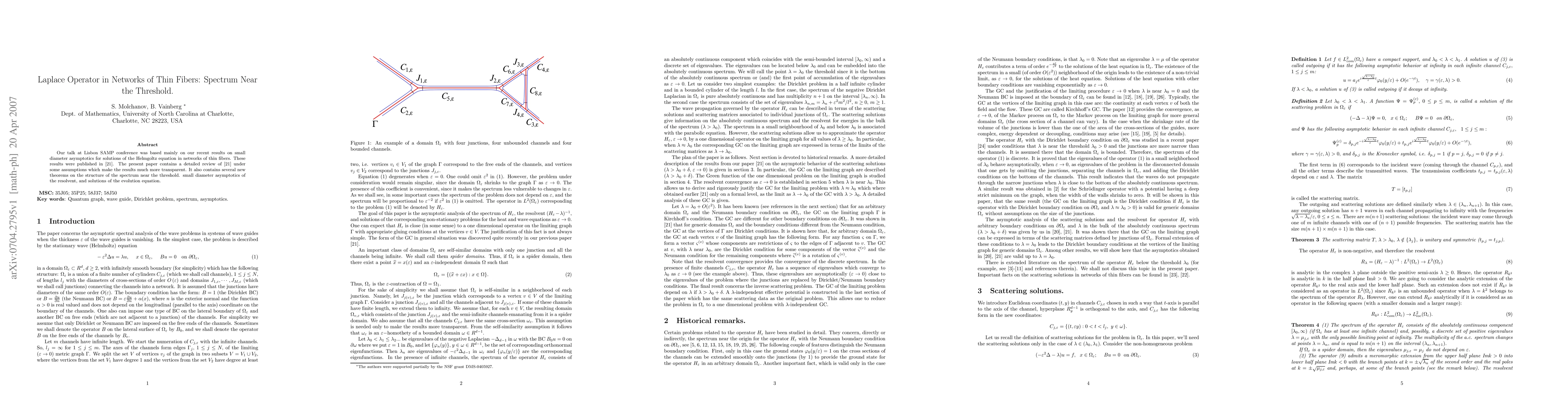 Our talk at Lisbon SAMP conference was based mainly on our recent results (published in Comm. Math. Phys.) on small diameter asymptotics for solutions of the Helmgoltz equation in networks of thin fibers. The present paper contains a detailed review of these results under some assumptions which make them much more transparent. It also contains several new theorems on the structure of the spectrum near the threshold. small diameter asymptotics of the resolvent, and solutions of the evolution equation.