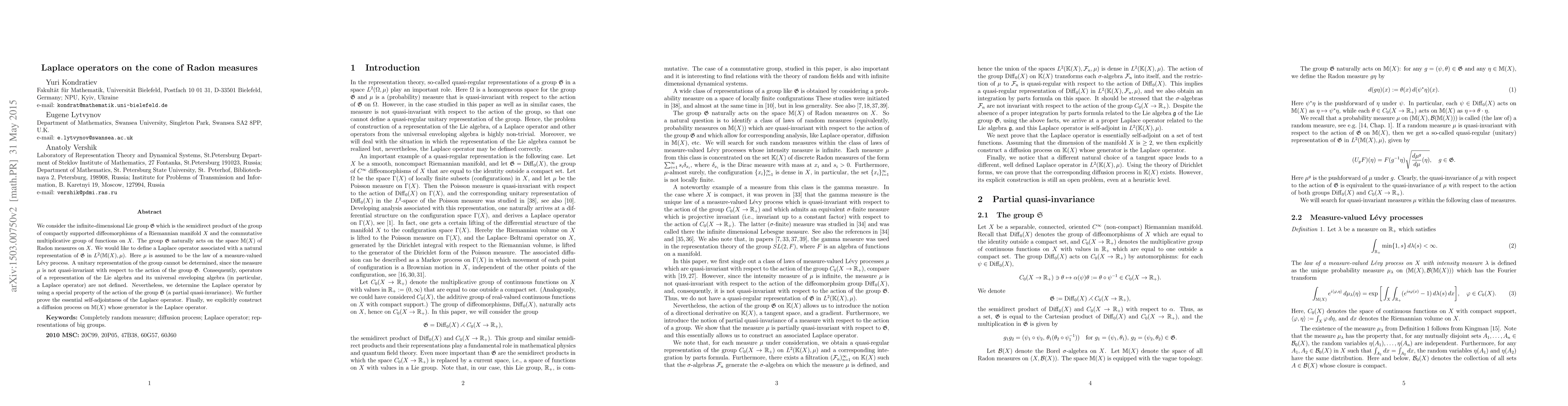 This paper defines a Laplace operator on the space of Radon measures on a Riemannian manifold $X$ under the action of an infinite-dimensional Lie group $\mathfrak G$. The authors determine the Laplace operator using a partial quasi-invariance property and prove its essential self-adjointness, constructing a diffusion process on the space of measures with the Laplace operator as its generator.