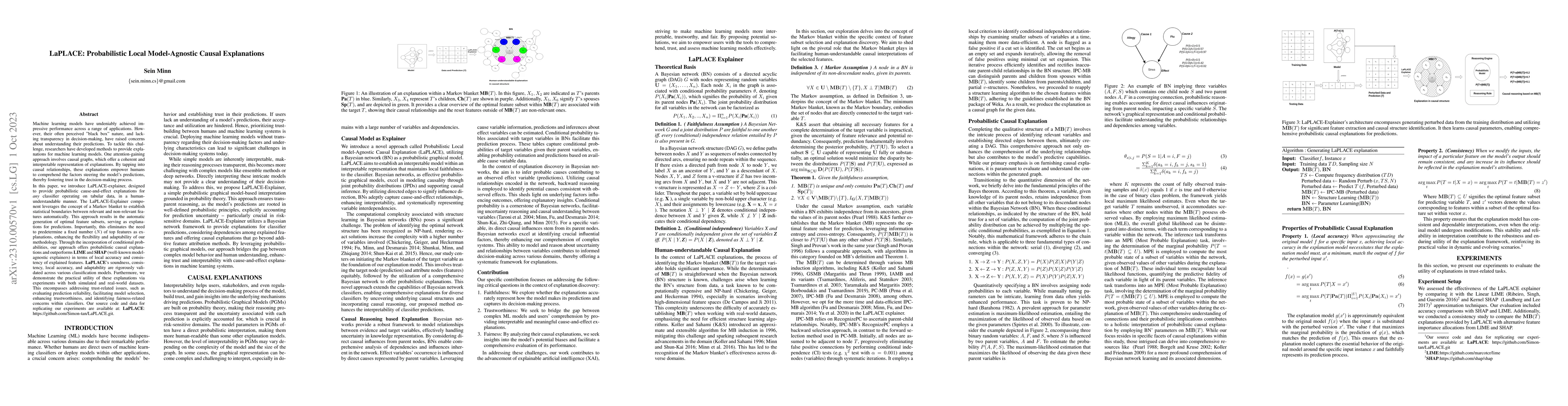 Machine learning models have undeniably achieved impressive performance across a range of applications. However, their often perceived black-box nature, and lack of transparency in decision-making, have raised concerns about understanding their predictions. To tackle this challenge, researchers have developed methods to provide explanations for machine learning models. In this paper, we introduce LaPLACE-explainer, designed to provide probabilistic cause-and-effect explanations for any classifier operating on tabular data, in a human-understandable manner. The LaPLACE-Explainer component leverages the concept of a Markov blanket to establish statistical boundaries between relevant and non-relevant features automatically. This approach results in the automatic generation of optimal feature subsets, serving as explanations for predictions. Importantly, this eliminates the need to predetermine a fixed number N of top features as explanations, enhancing the flexibility and adaptability of our methodology. Through the incorporation of conditional probabilities, our approach offers probabilistic causal explanations and outperforms LIME and SHAP (well-known model-agnostic explainers) in terms of local accuracy and consistency of explained features. LaPLACE's soundness, consistency, local accuracy, and adaptability are rigorously validated across various classification models. Furthermore, we demonstrate the practical utility of these explanations via experiments with both simulated and real-world datasets. This encompasses addressing trust-related issues, such as evaluating prediction reliability, facilitating model selection, enhancing trustworthiness, and identifying fairness-related concerns within classifiers.