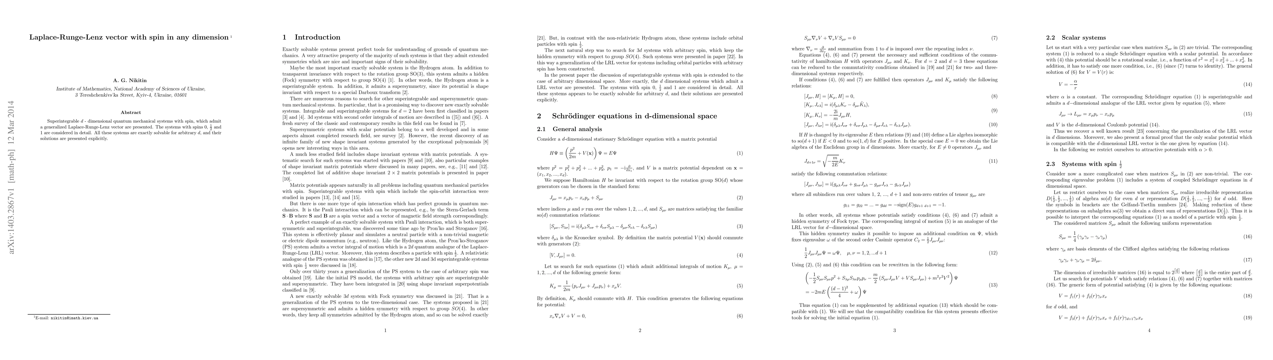 This paper presents superintegrable quantum mechanical systems with spin in any dimension that possess a generalized Laplace-Runge-Lenz vector, providing exact solutions for systems with spins 0, 1/2, and 1. The solutions are explicitly derived for arbitrary dimensions.
