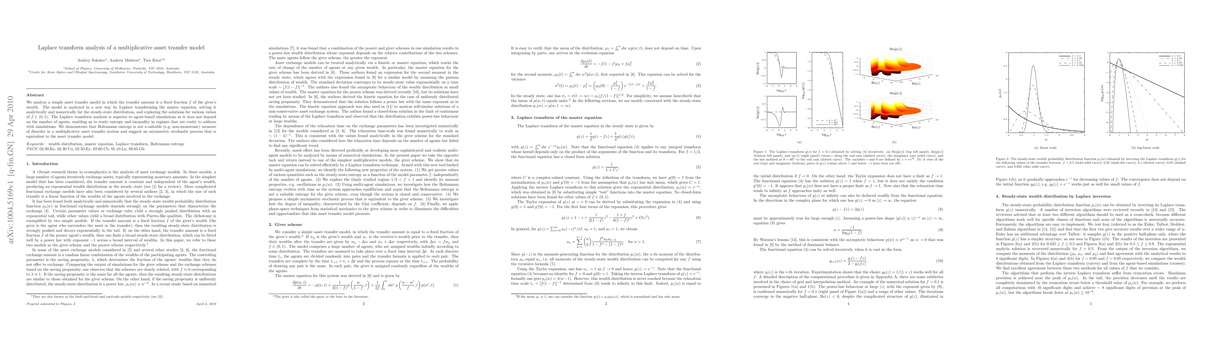 This paper employs Laplace transform analysis to study a multiplicative asset transfer model where the transfer amount is a fixed fraction of the giver's wealth. The analysis reveals that Boltzmann entropy is not a suitable measure of disorder in this system and proposes an asymmetric stochastic process as an equivalent model.