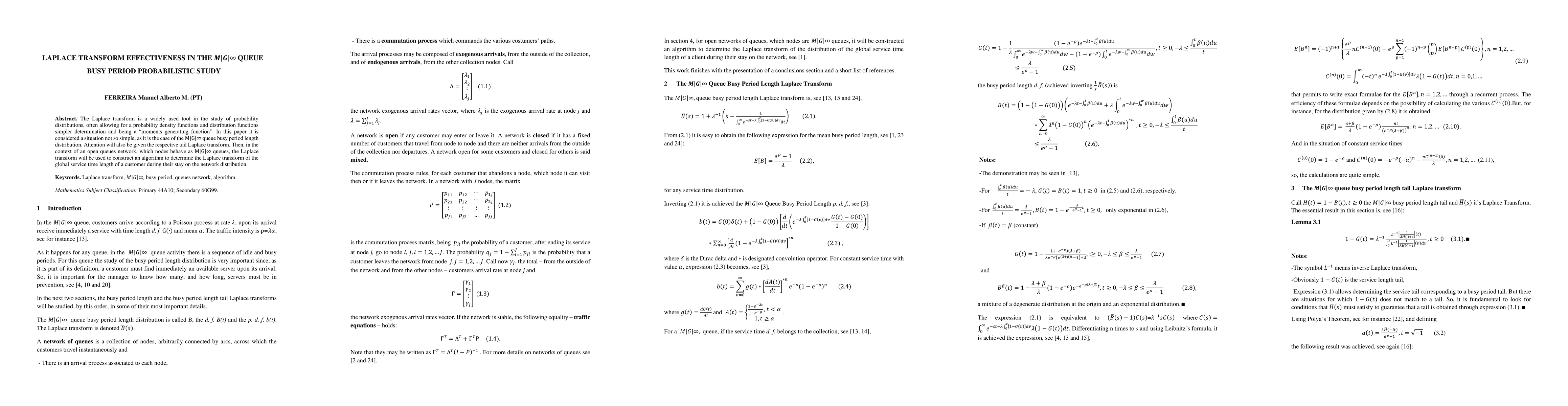 The Laplace transform is a widely used tool in the study of probability distributions, often allowing for a probability density functions and distribution functions simpler determination and being a moments generating function. In this paper it is considered a situation not so simple, as it is the case of the MGinf queue busy period length distribution. Attention will also be given the respective tail Laplace transform. Then, in the context of an open queues network, which nodes behave as MGinf queues, the Laplace transform will be used to construct an algorithm to determine the Laplace transform of the global service time length of a customer during their stay on the network distribution.