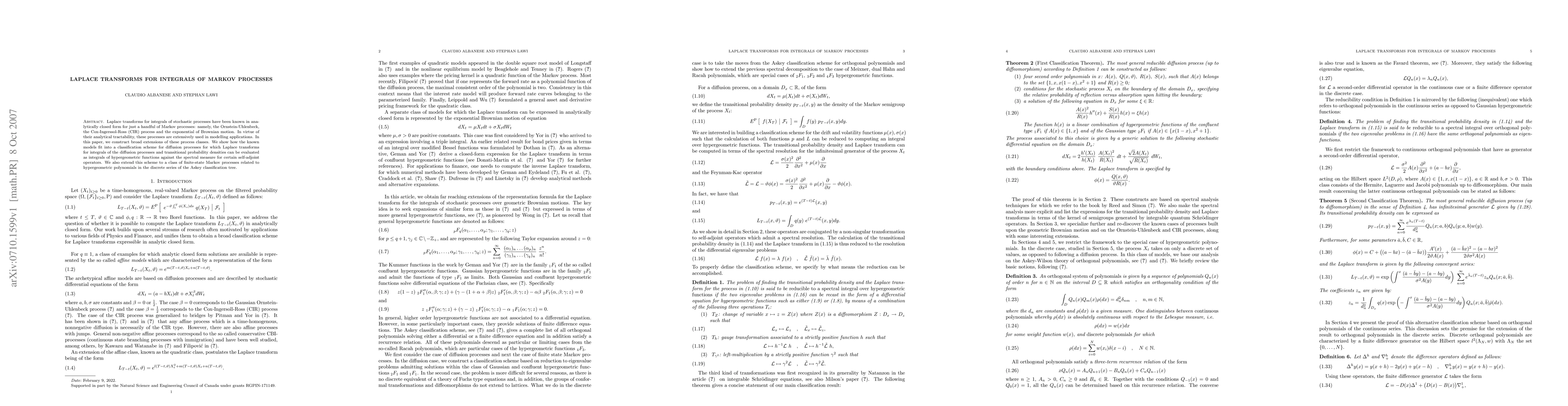 Laplace transforms for integrals of stochastic processes have been known in analytically closed form for just a handful of Markov processes: namely, the Ornstein-Uhlenbeck, the Cox-Ingerssol-Ross (CIR) process and the exponential of Brownian motion. In virtue of their analytical tractability, these processes are extensively used in modelling applications. In this paper, we construct broad extensions of these process classes. We show how the known models fit into a classification scheme for diffusion processes for which Laplace transforms for integrals of the diffusion processes and transitional probability densities can be evaluated as integrals of hypergeometric functions against the spectral measure for certain self-adjoint operators. We also extend this scheme to a class of finite-state Markov processes related to hypergeometric polynomials in the discrete series of the Askey classification tree.