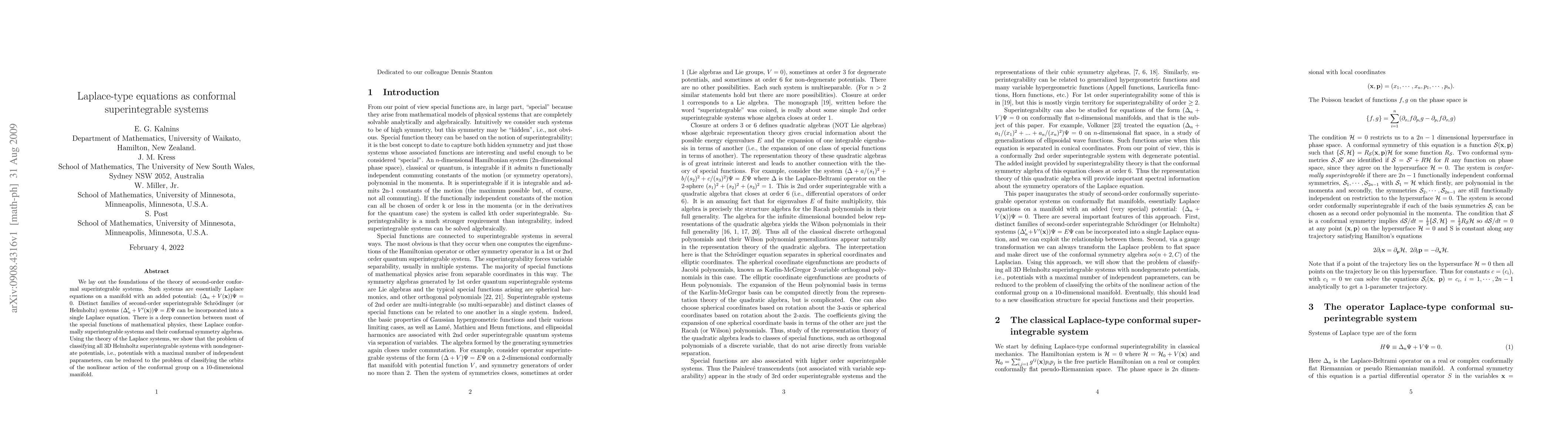 We lay out the foundations of the theory of second-order conformal superintegrable systems. Such systems are essentially Laplace equations on a manifold with an added potential: $(\Delta_n+V({\bf x}))\Psi=0$. Distinct families of second-order superintegrable Schr\"odinger (or Helmholtz) systems $(\Delta'_n+V'({\bf x}))\Psi=E\Psi$ can be incorporated into a single Laplace equation. There is a deep connection between most of the special functions of mathematical physics, these Laplace conformally superintegrable systems and their conformal symmetry algebras. Using the theory of the Laplace systems, we show that the problem of classifying all 3D Helmholtz superintegrable systems with nondegenerate potentials, i.e., potentials with a maximal number of independent paprameters, can be reduced to the problem of classifying the orbits of the nonlinear action of the conformal group on a 10-dimensional manifold.