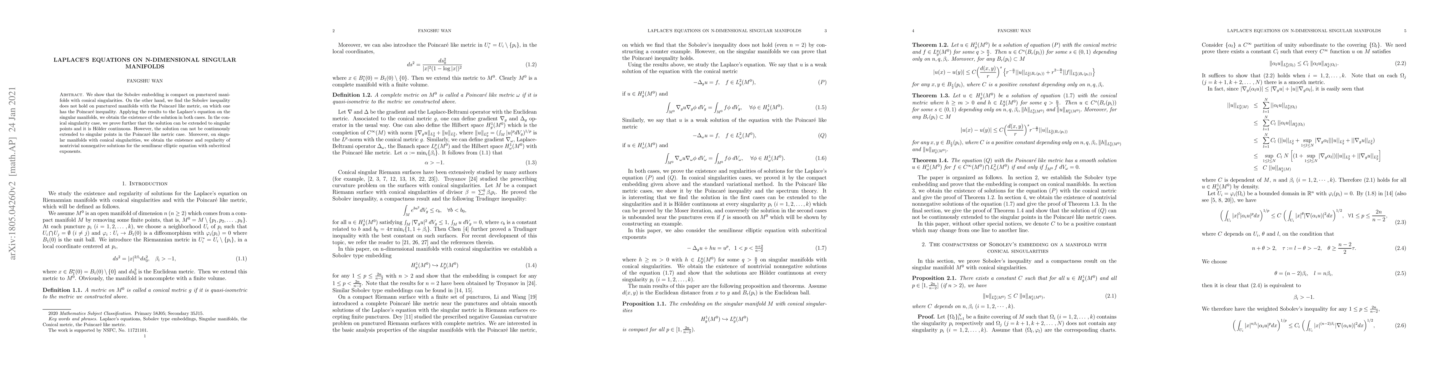 We show that the Sobolev embedding is compact on punctured manifolds with conical singularities. On the other hand, we find the Sobolev inequality does not hold on punctured manifolds with Poincar\'{e} like metric, on which one has Poincar\'{e} inequality. Applying the results to the Laplace's equation on the singular manifolds, we obtain the existences of the solution in both cases. In conical singularity case, we prove further that the solution can be extended to the singular points and it is H\"{o}lder continuous. However, the solution can not be continuously extended to the singular points in Poincar\'{e} like metric case. Moreover, on singular manifolds with conical singularities, we obtain the existence and regularity result of nontrivial nonnegative solutions for the semilinear elliptic equation with subcritical exponent.