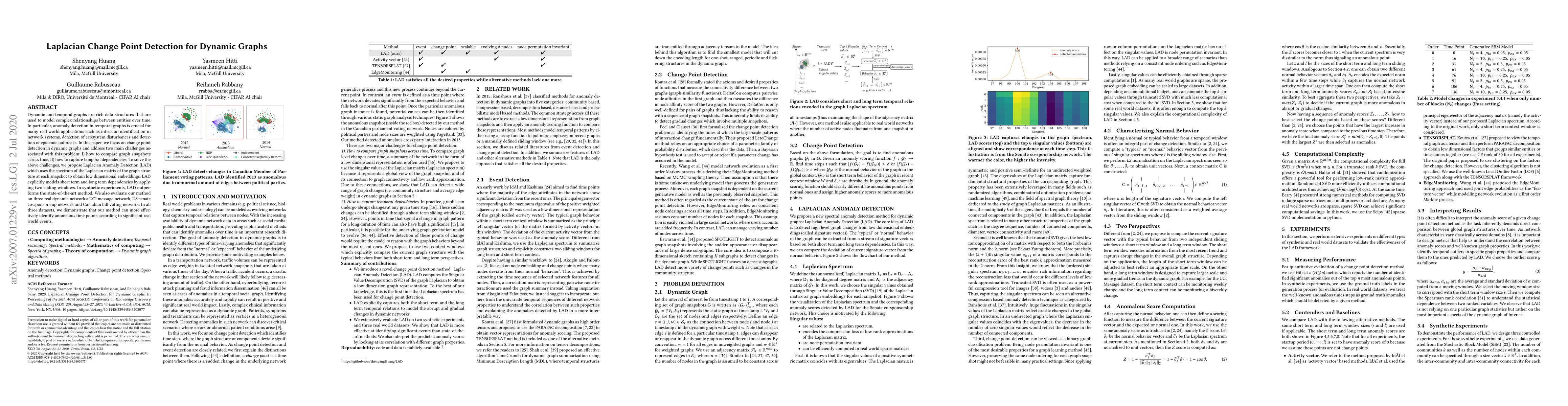 This paper proposes Laplacian Anomaly Detection (LAD) for identifying change points in dynamic graphs by comparing graph snapshots across time and capturing temporal dependencies. LAD outperforms existing methods in synthetic experiments and effectively identifies anomalies in real-world networks like the UCI message network and US senate co-sponsorship network.