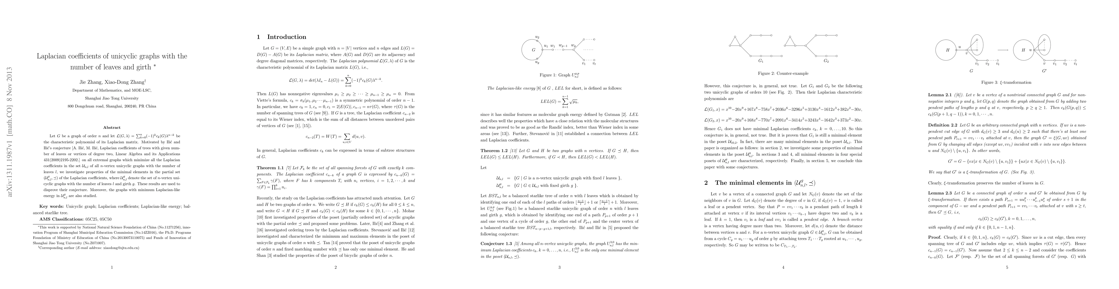 Let $G$ be a graph of order $n$ and let $\mathcal{L}(G,\lambda)=\sum_{k=0}^n (-1)^{k}c_{k}(G)\lambda^{n-k}$ be the characteristic polynomial of its Laplacian matrix. Motivated by Ili\'{c} and Ili\'{c}'s conjecture [A. Ili\'{c}, M. Ili\'{c}, Laplacian coefficients of trees with given number of leaves or vertices of degree two, Linear Algebra and its Applications 431(2009)2195-2202.] on all extremal graphs which minimize all the Laplacian coefficients in the set $\mathcal{U}_{n,l}$ of all $n$-vertex unicyclic graphs with the number of leaves $l$, we investigate properties of the minimal elements in the partial set $(\mathcal{U}_{n,l}^g, \preceq)$ of the Laplacian coefficients, where $\mathcal{U}_{n,l}^g$ denote the set of $n$-vertex unicyclic graphs with the number of leaves $l$ and girth $g$. These results are used to disprove their conjecture. Moreover, the graphs with minimum Laplacian-like energy in $\mathcal{U}_{n,l}^g$ are also studied.