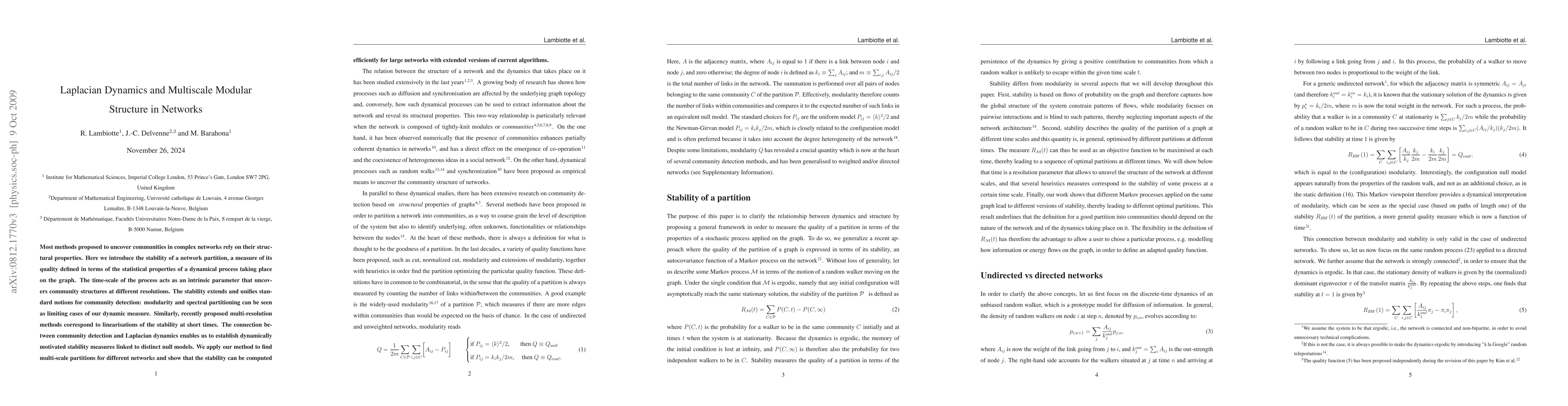 Most methods proposed to uncover communities in complex networks rely on their structural properties. Here we introduce the stability of a network partition, a measure of its quality defined in terms of the statistical properties of a dynamical process taking place on the graph. The time-scale of the process acts as an intrinsic parameter that uncovers community structures at different resolutions. The stability extends and unifies standard notions for community detection: modularity and spectral partitioning can be seen as limiting cases of our dynamic measure. Similarly, recently proposed multi-resolution methods correspond to linearisations of the stability at short times. The connection between community detection and Laplacian dynamics enables us to establish dynamically motivated stability measures linked to distinct null models. We apply our method to find multi-scale partitions for different networks and show that the stability can be computed efficiently for large networks with extended versions of current algorithms.