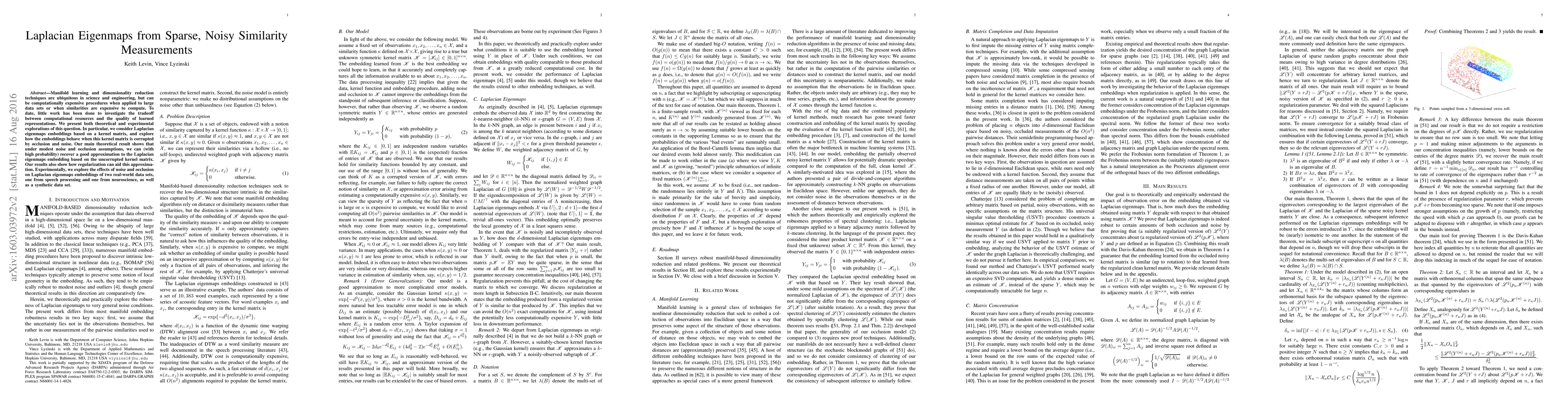 The paper presents a theoretical result showing that under certain assumptions, the Laplacian eigenmaps embedding can be recovered from a noisy and occluded kernel matrix, along with experimental validation on real-world datasets.