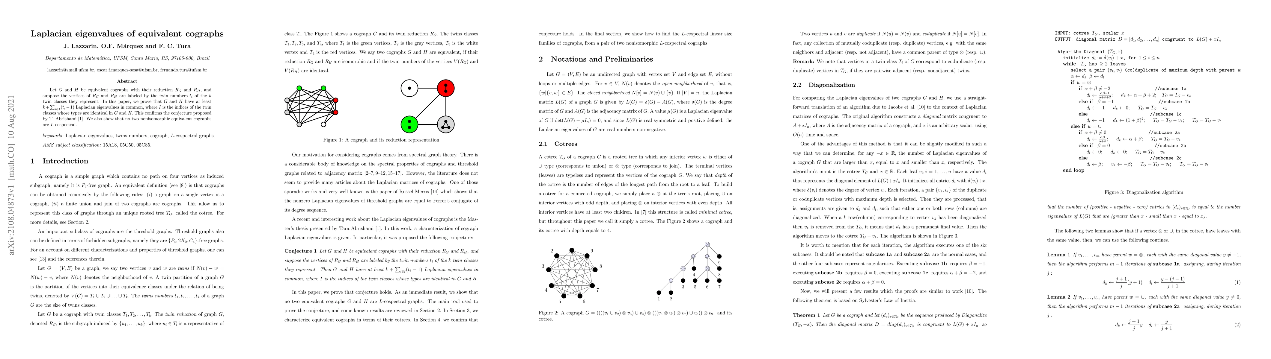 Research confirms that equivalent cographs share at least k + πsum_{i−I}(t_i-1) Laplacian eigenvalues, resolving a conjecture on their spectral properties. No two nonisomorphic equivalent cographs are L-cospectral.
